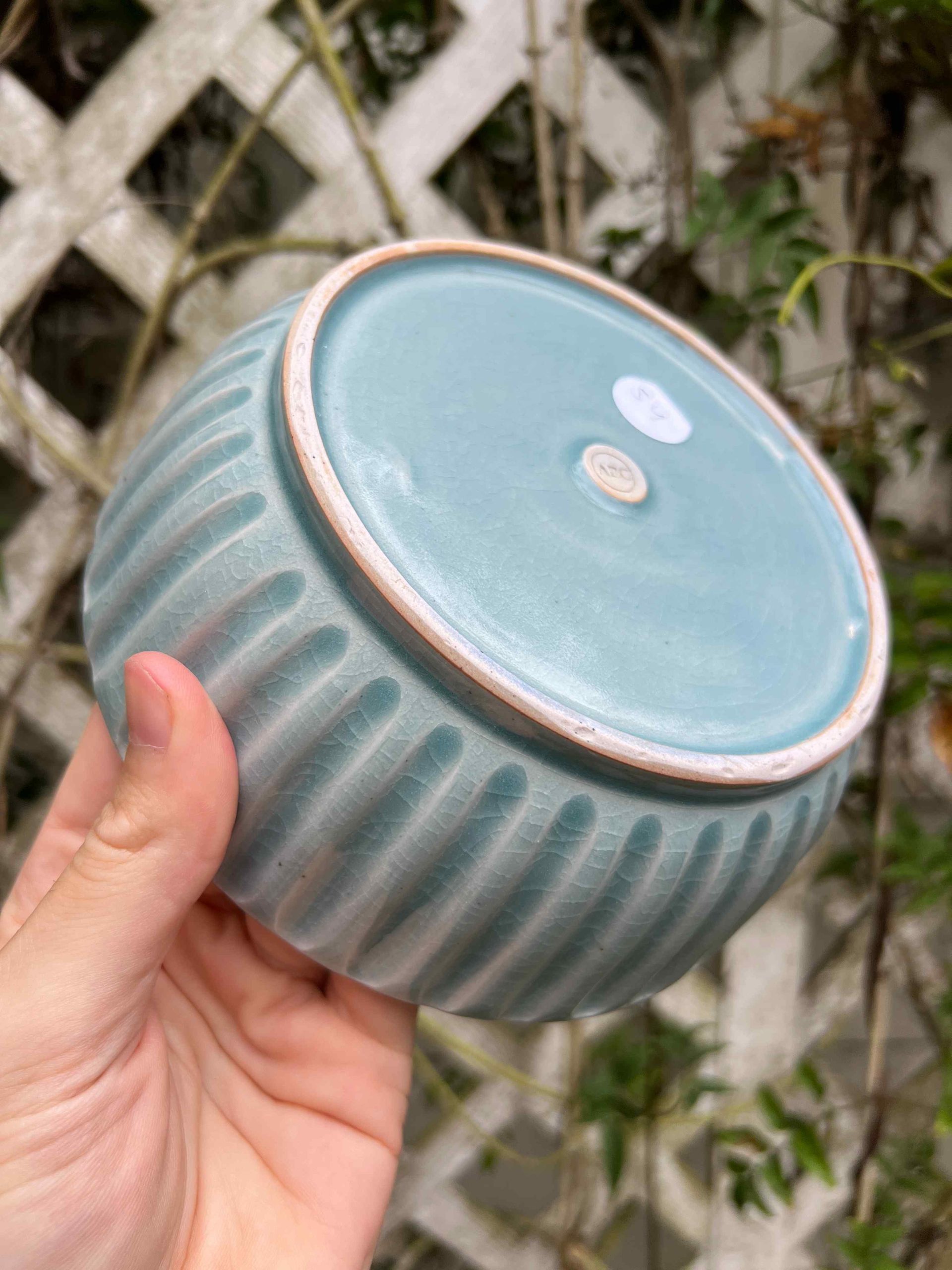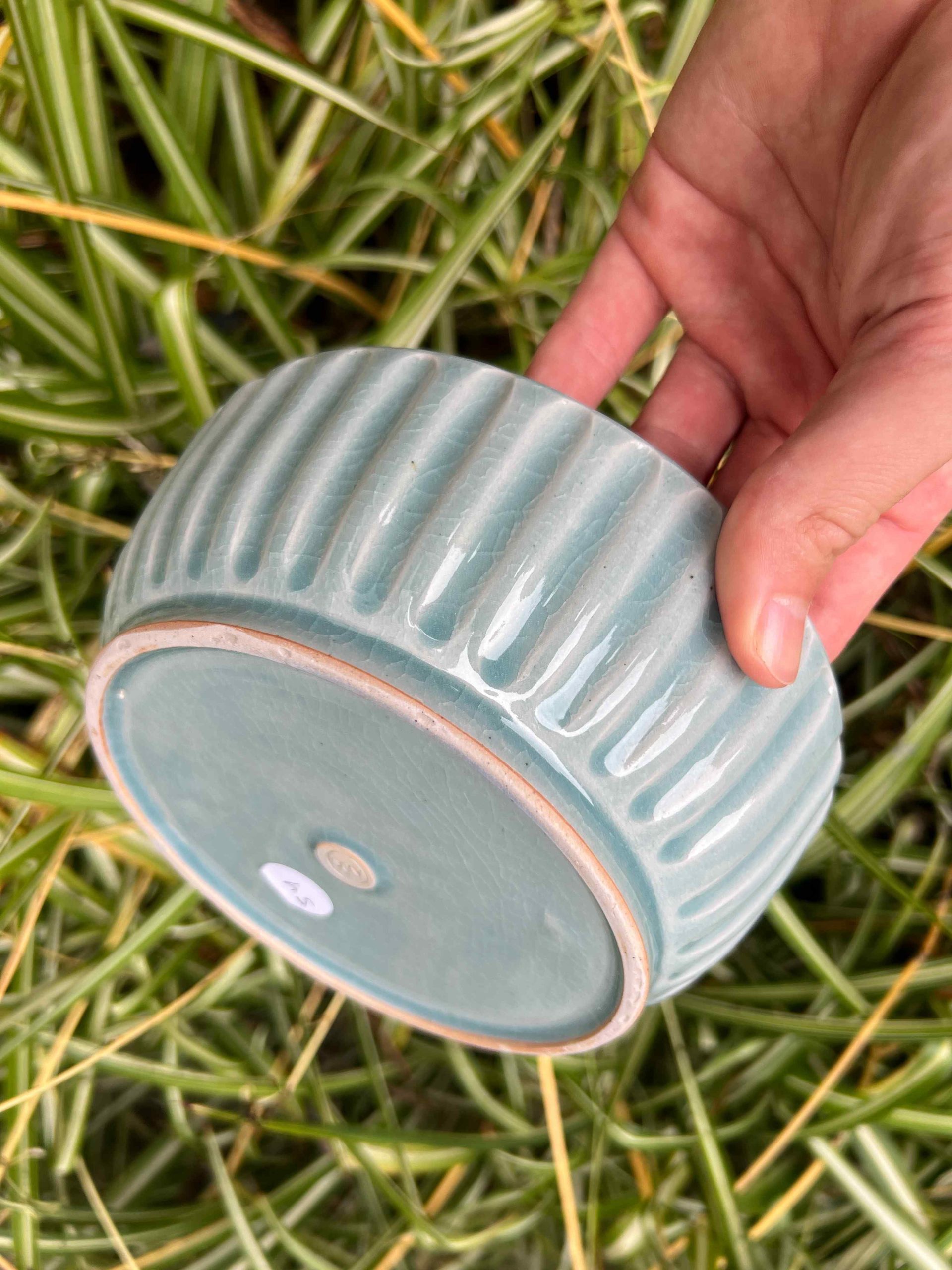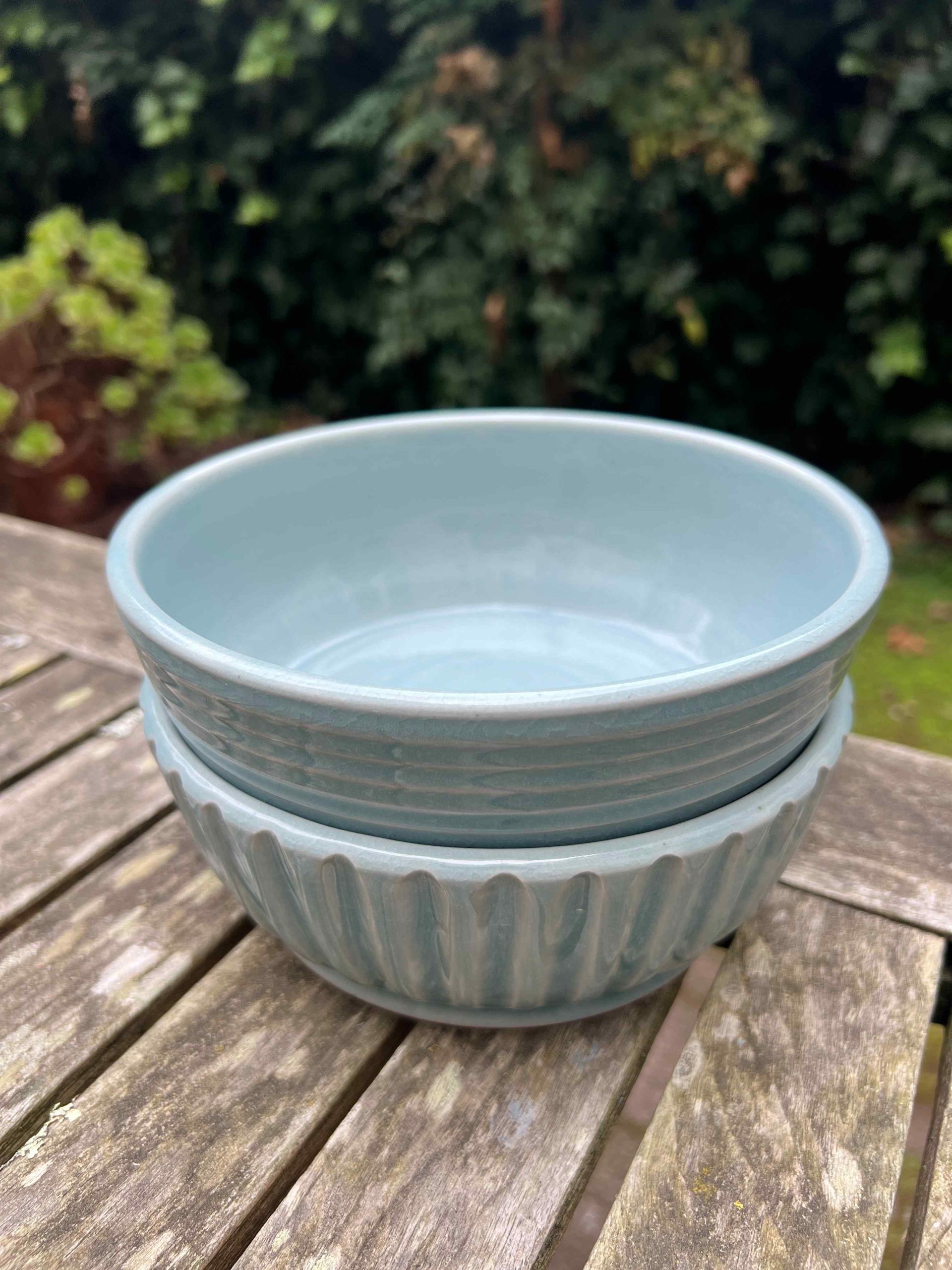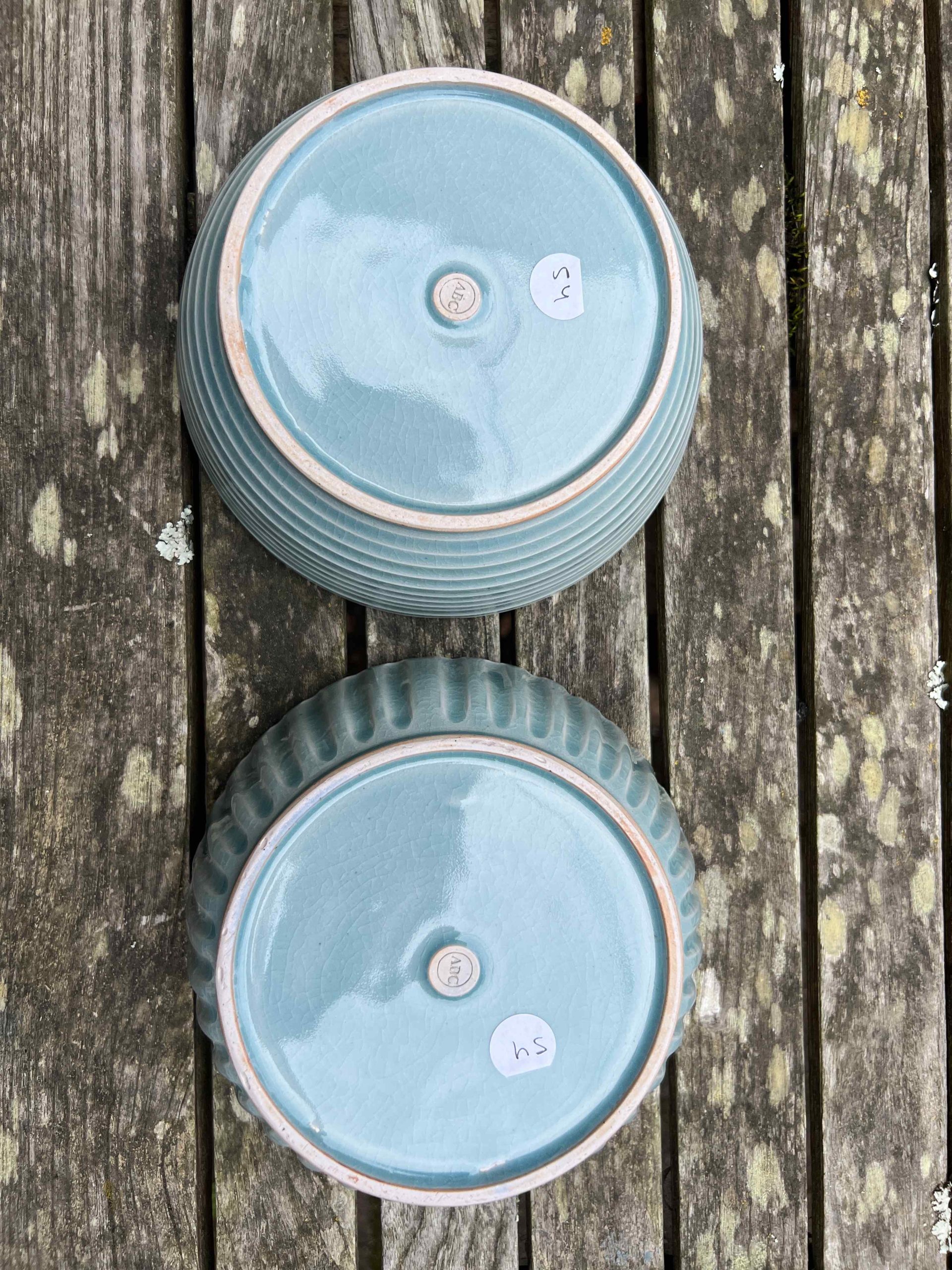 This bowl set is considered a second. On the exterior there is some minor crawling at the base where the glaze got thick. Still completely functional, minor aesthetic fault.