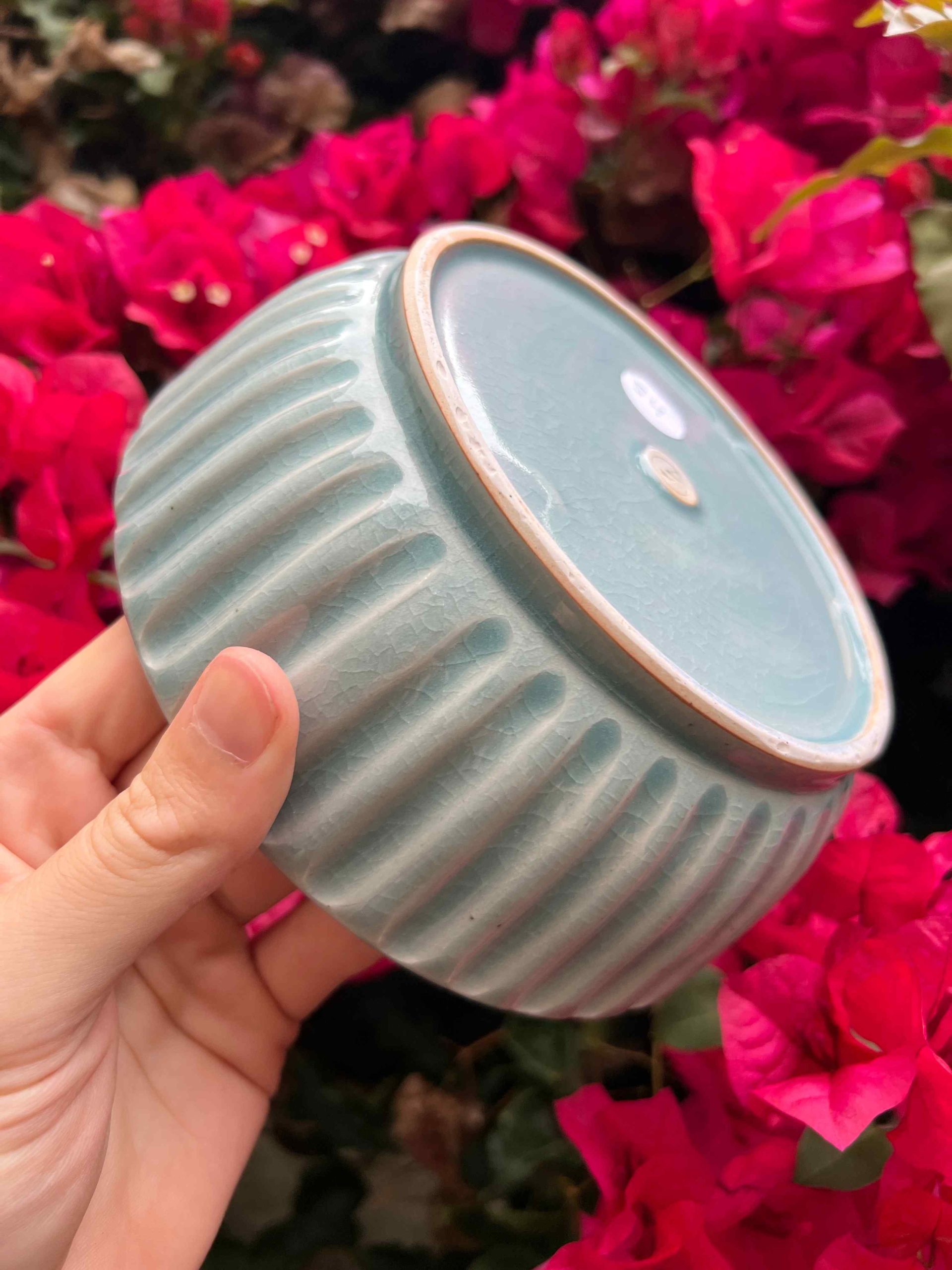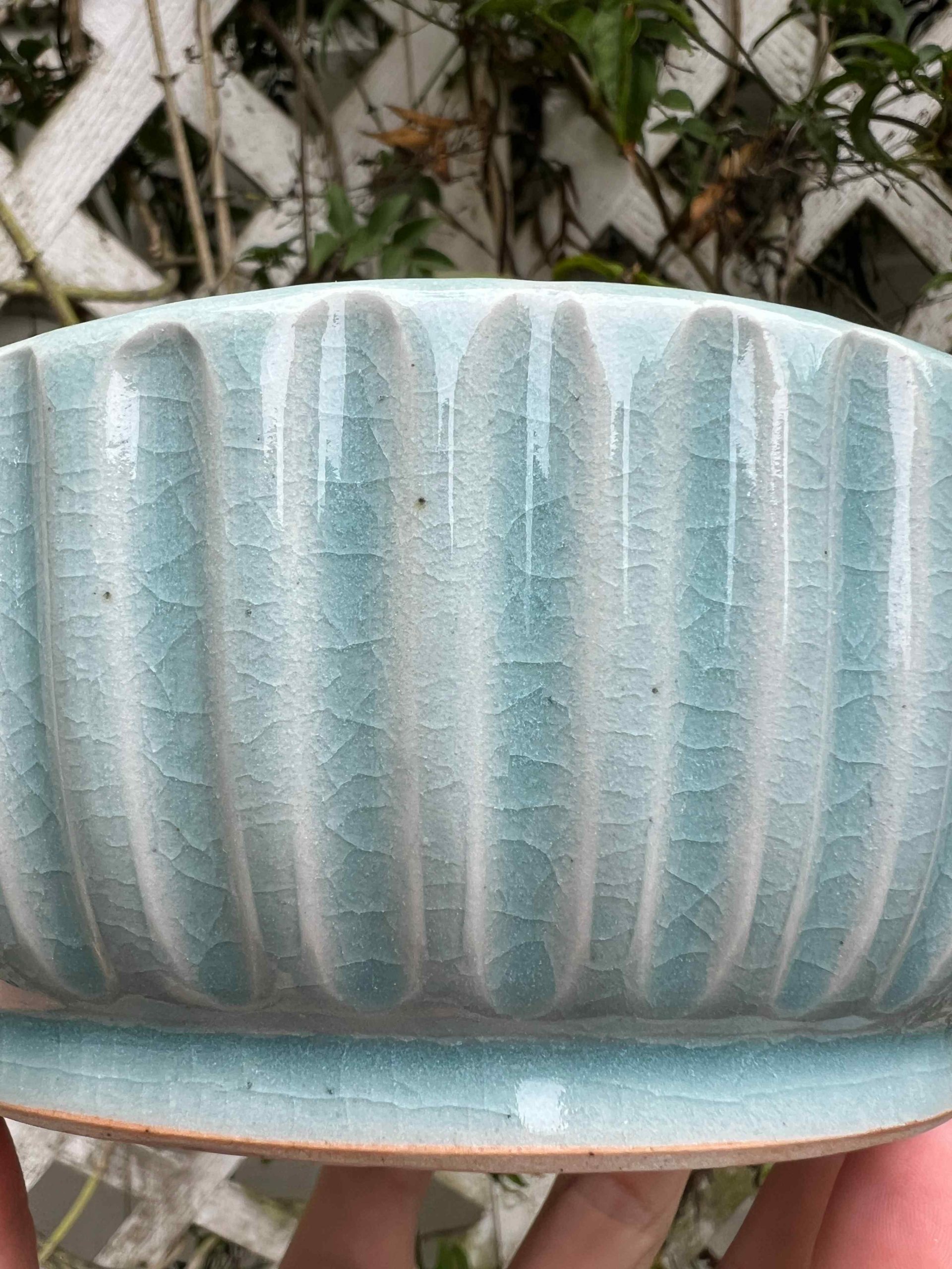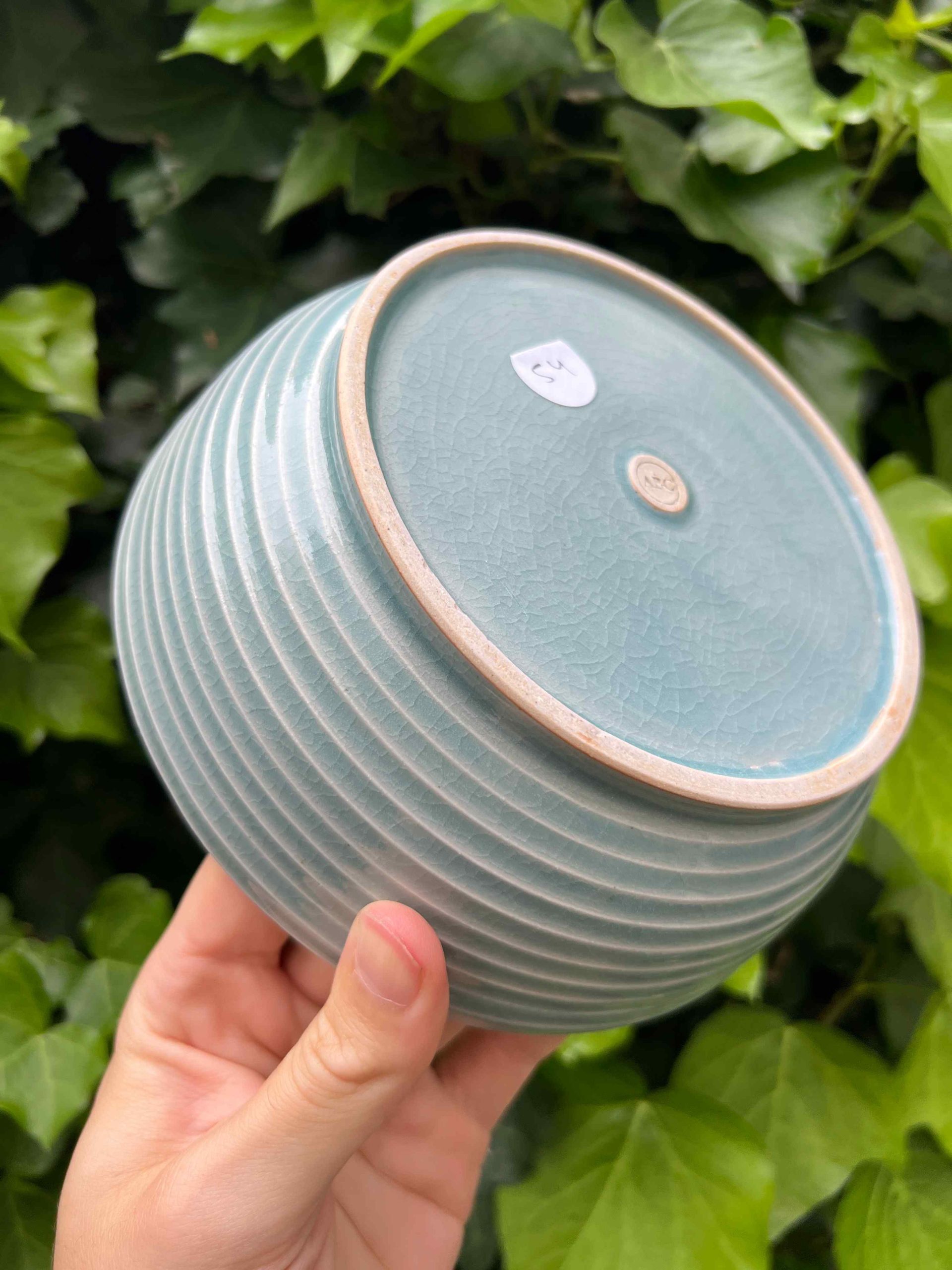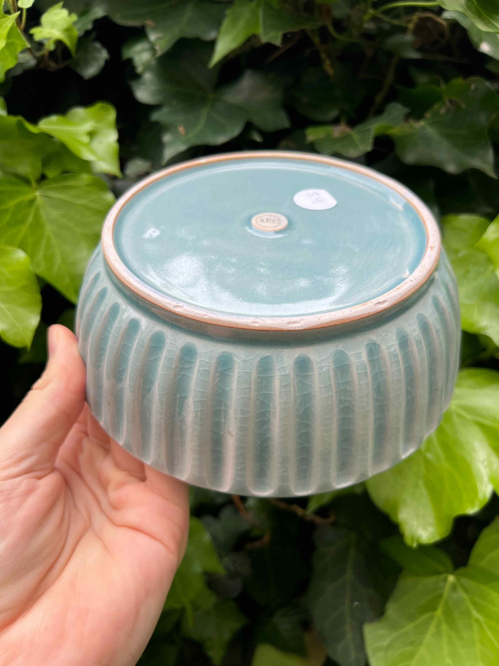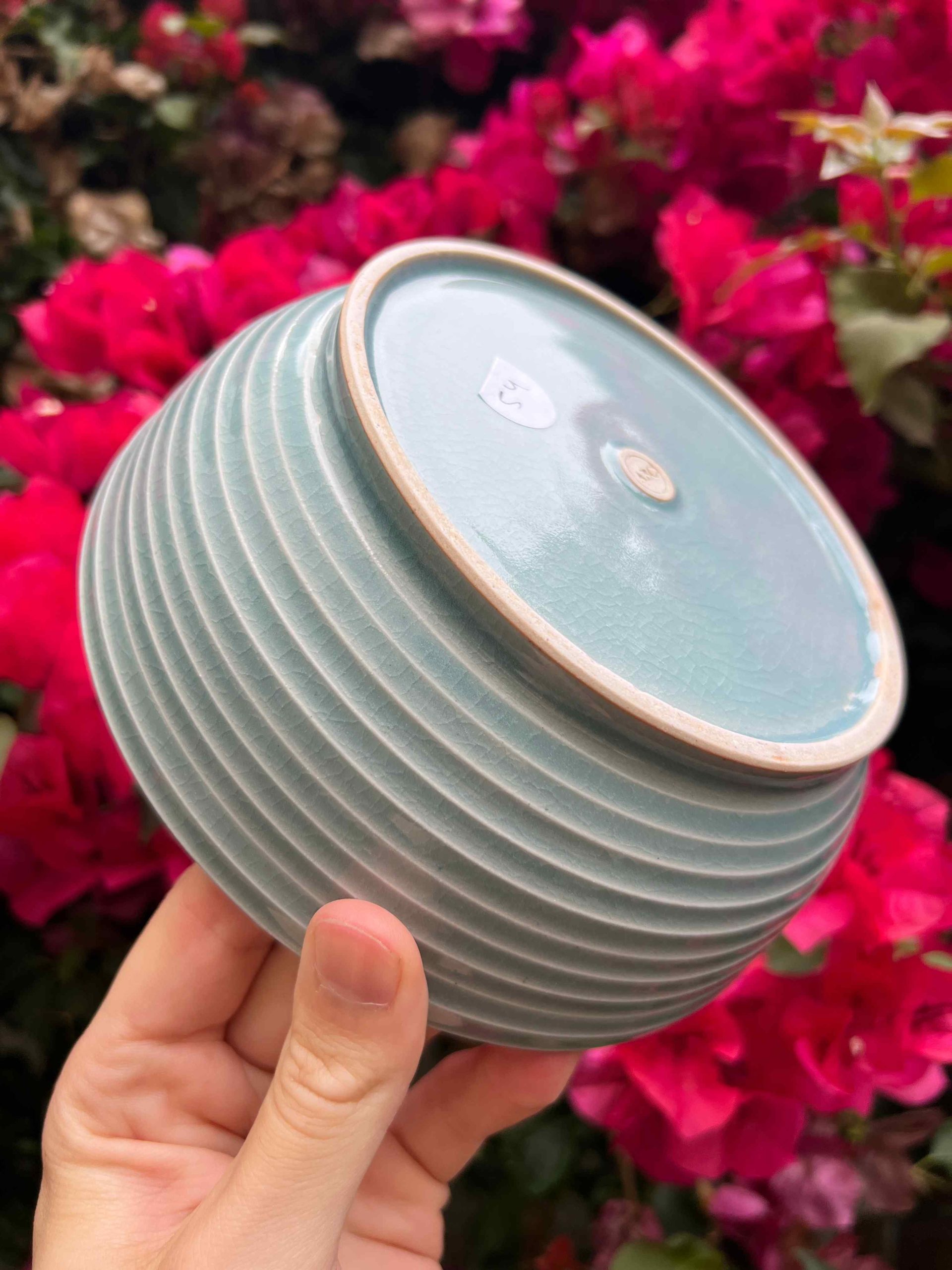This bowl set is considered a second. On the exterior there is some minor crawling at the base where the glaze got thick. Still completely functional, minor aesthetic fault.