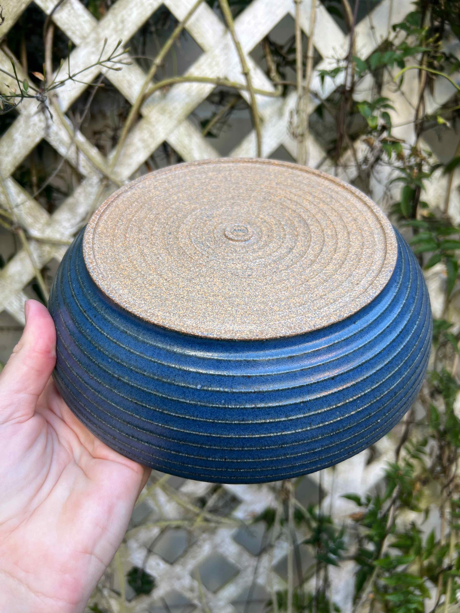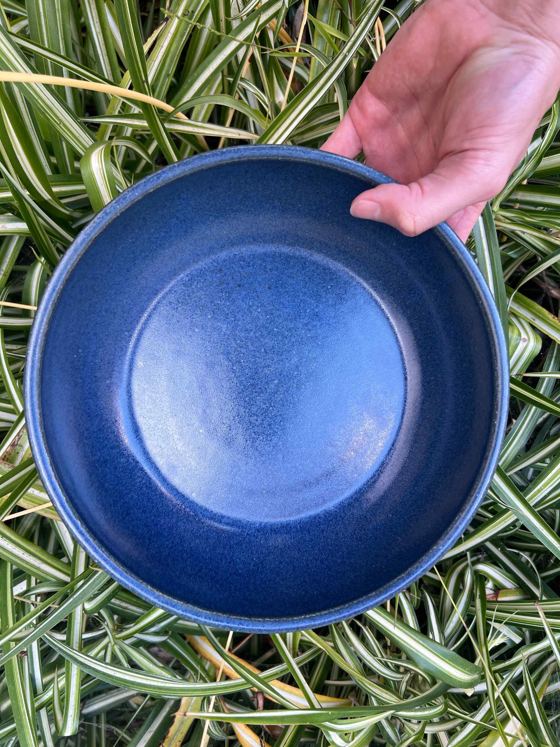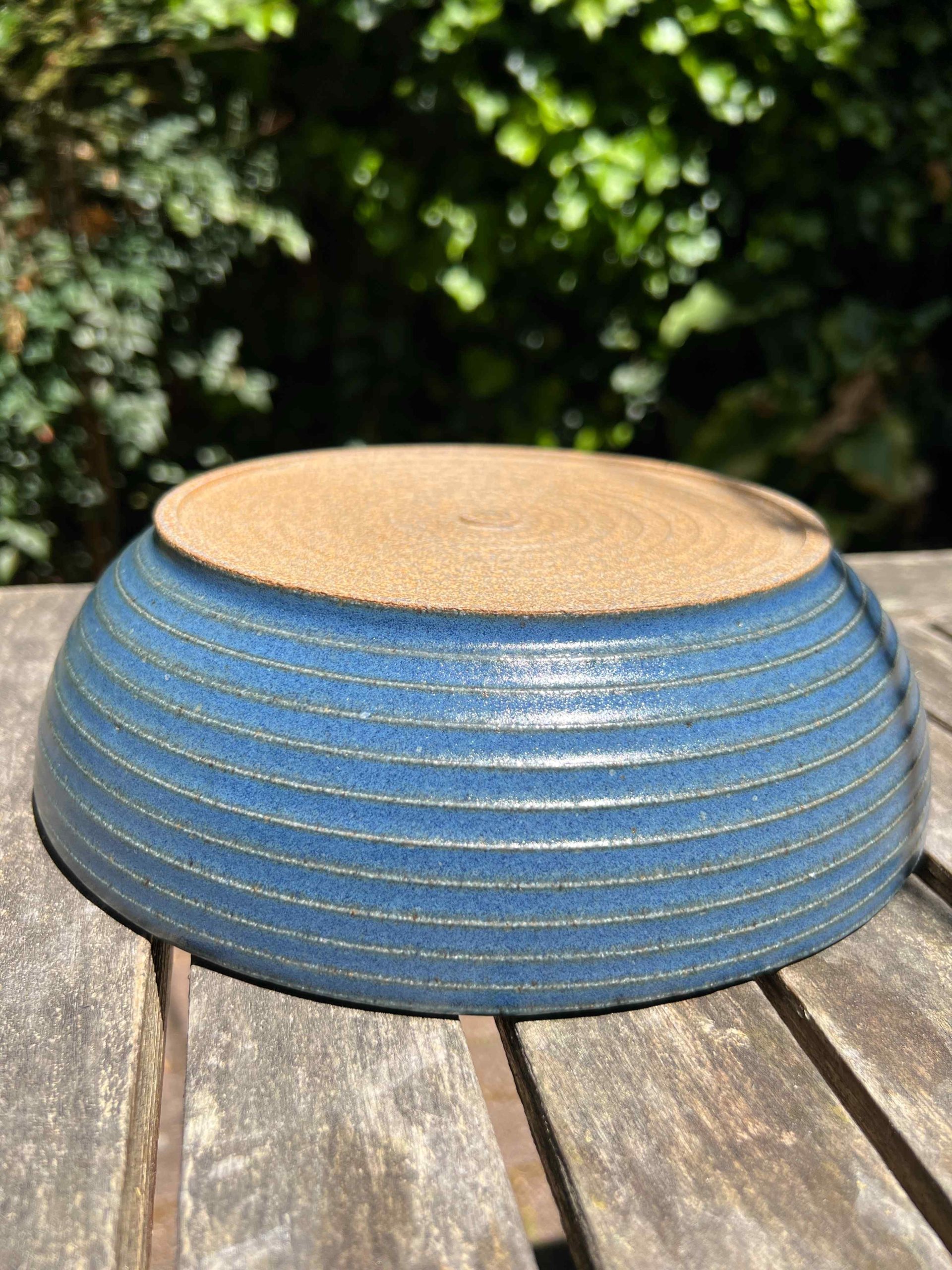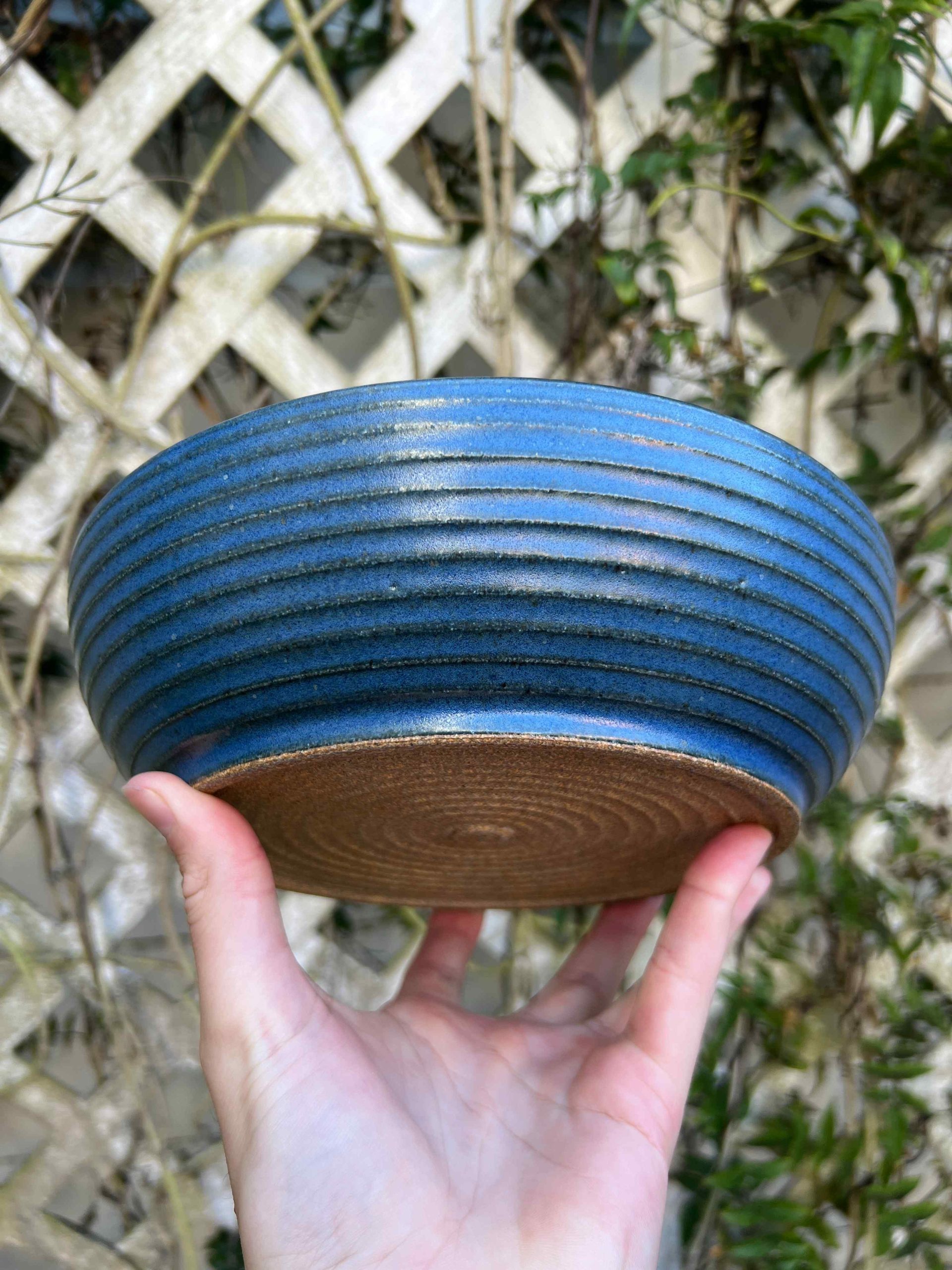 Our blue serving bowl is a great wide bowl for your next dinner party. The texture is added after the trimming process. The perfect piece for any kitchen.