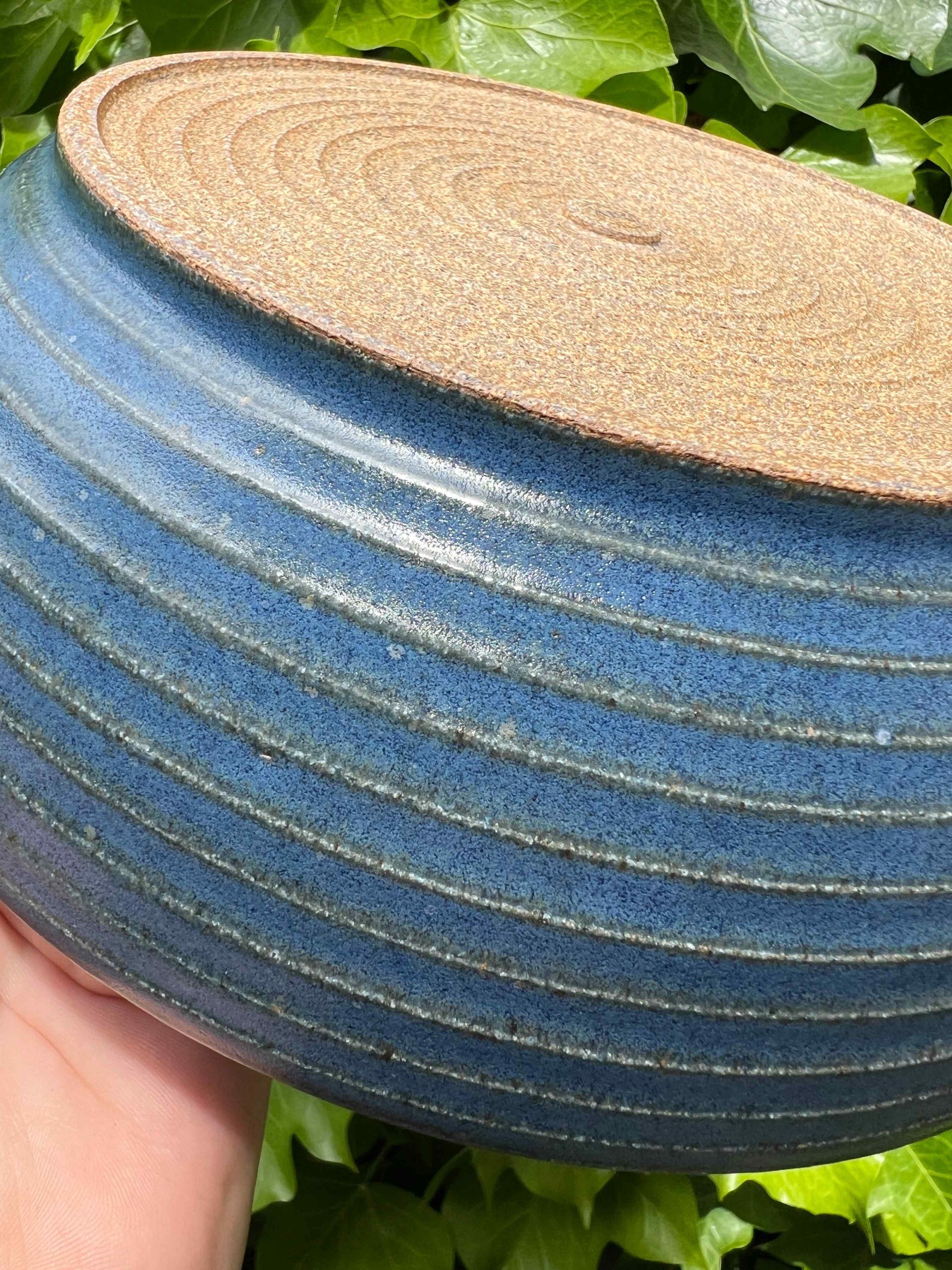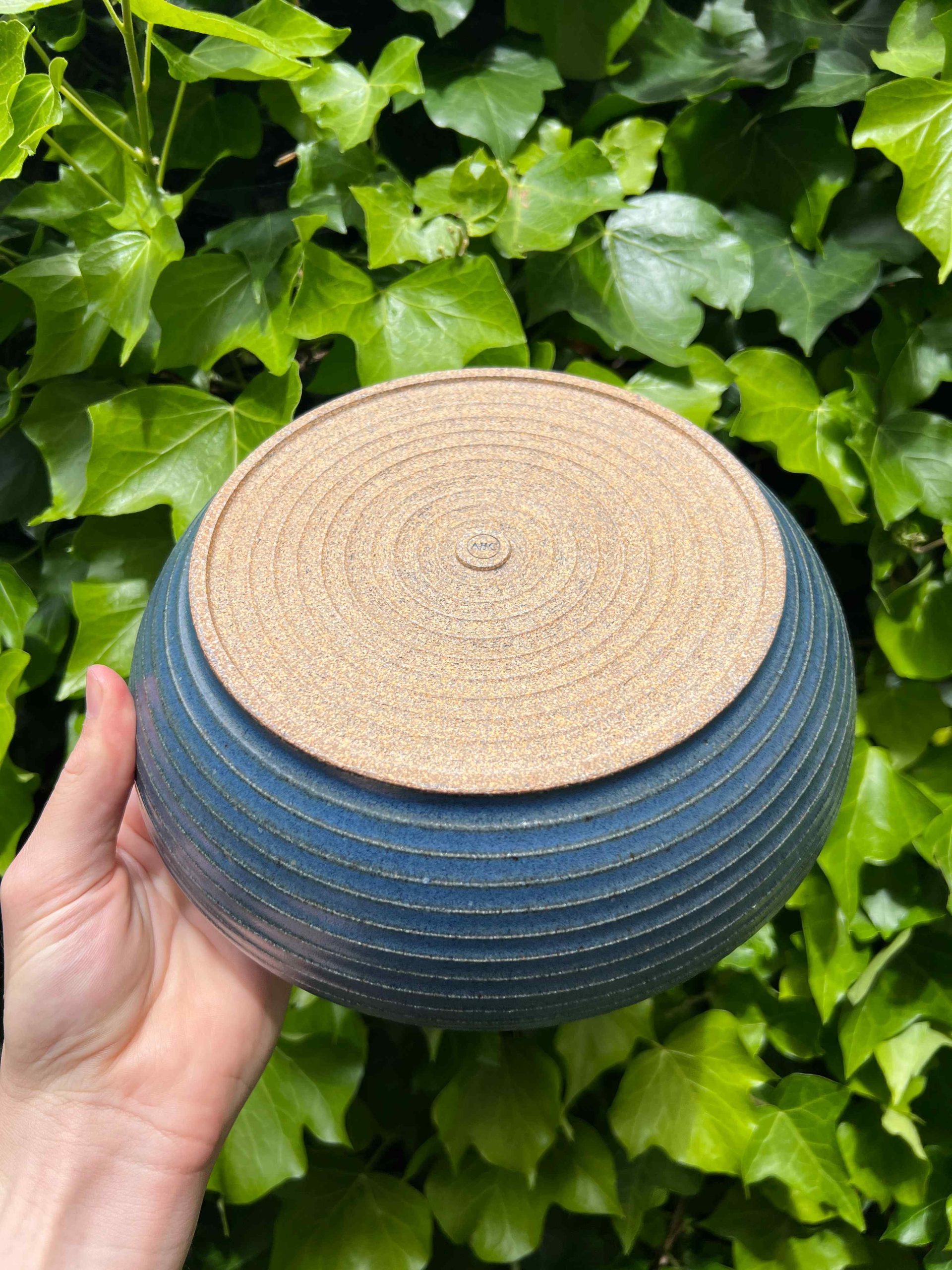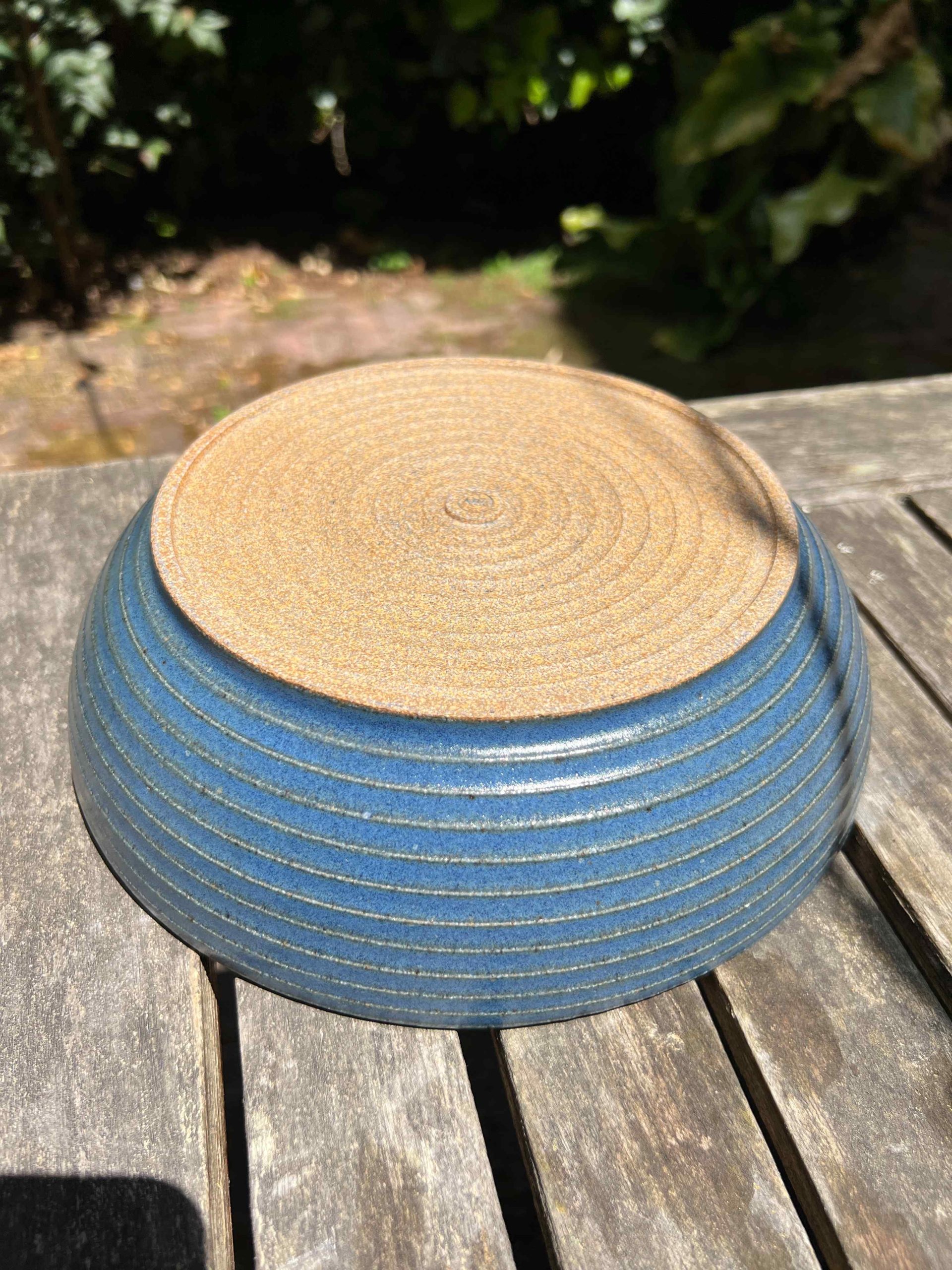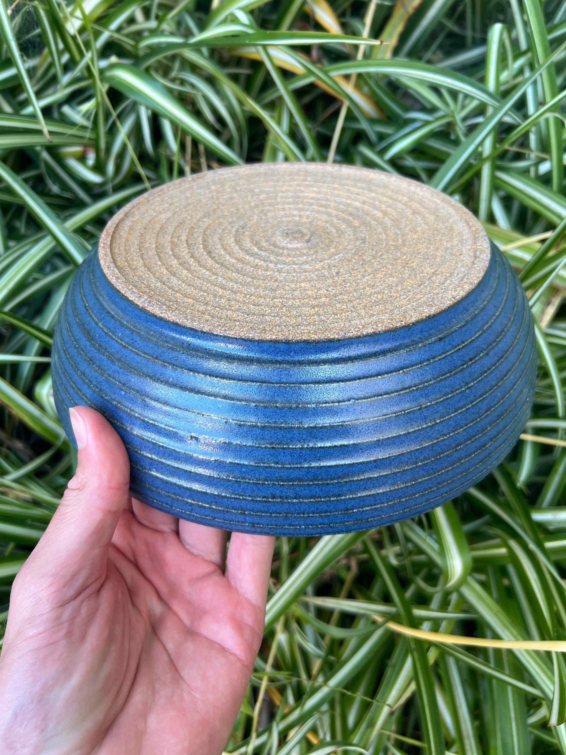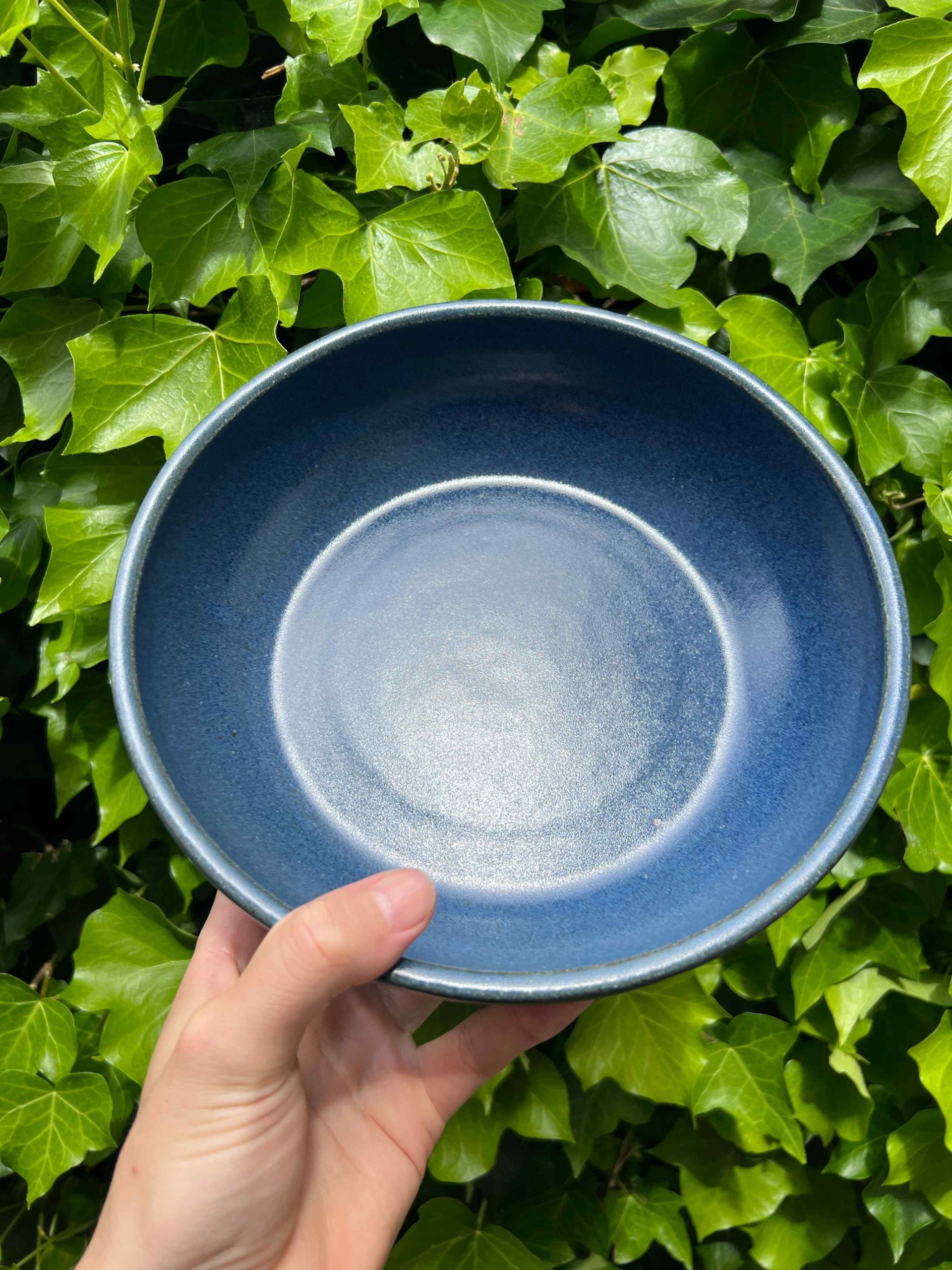 Our blue serving bowl is a great wide bowl for your next dinner party. The texture is added after the trimming process. The perfect piece for any kitchen.