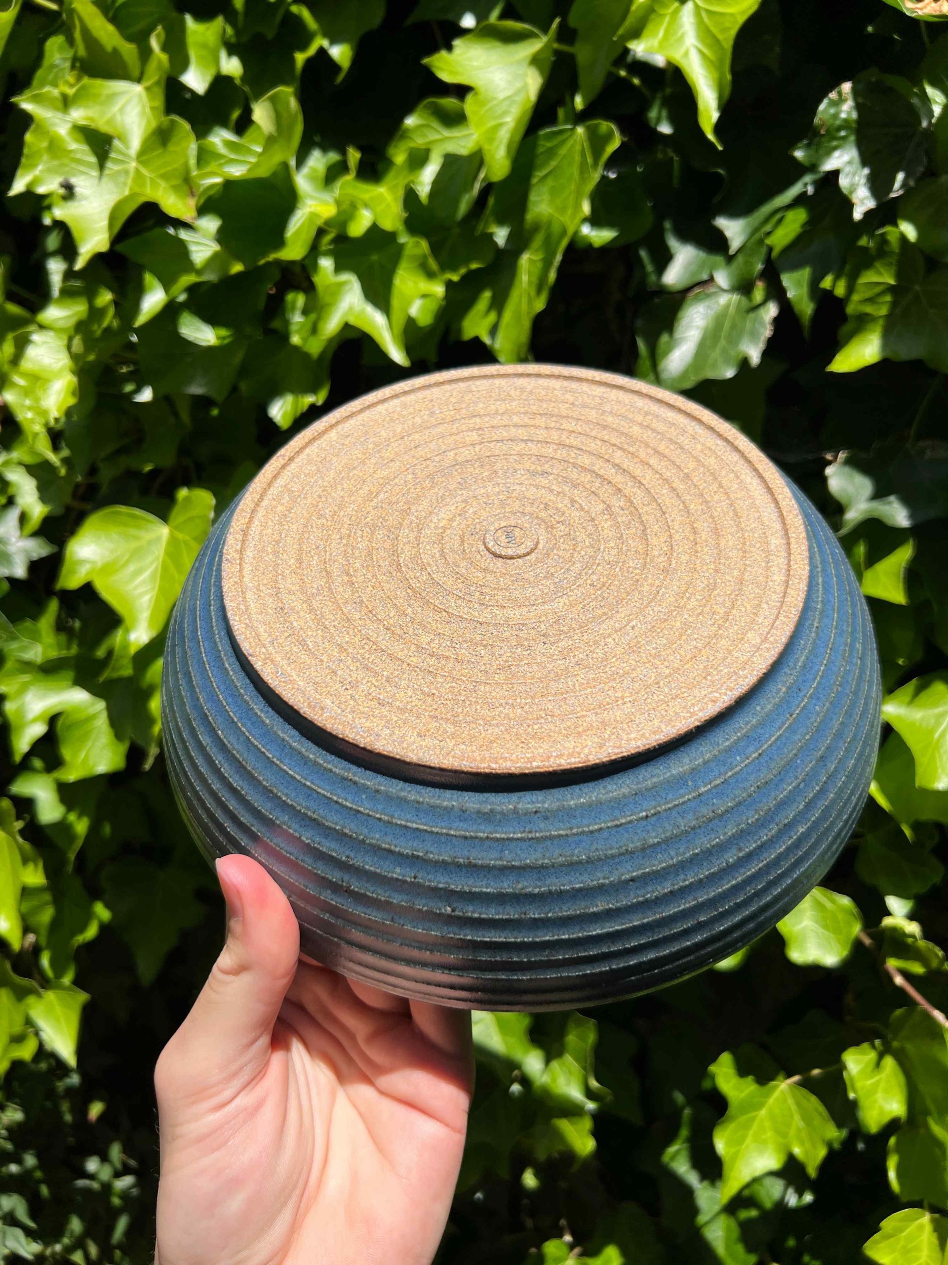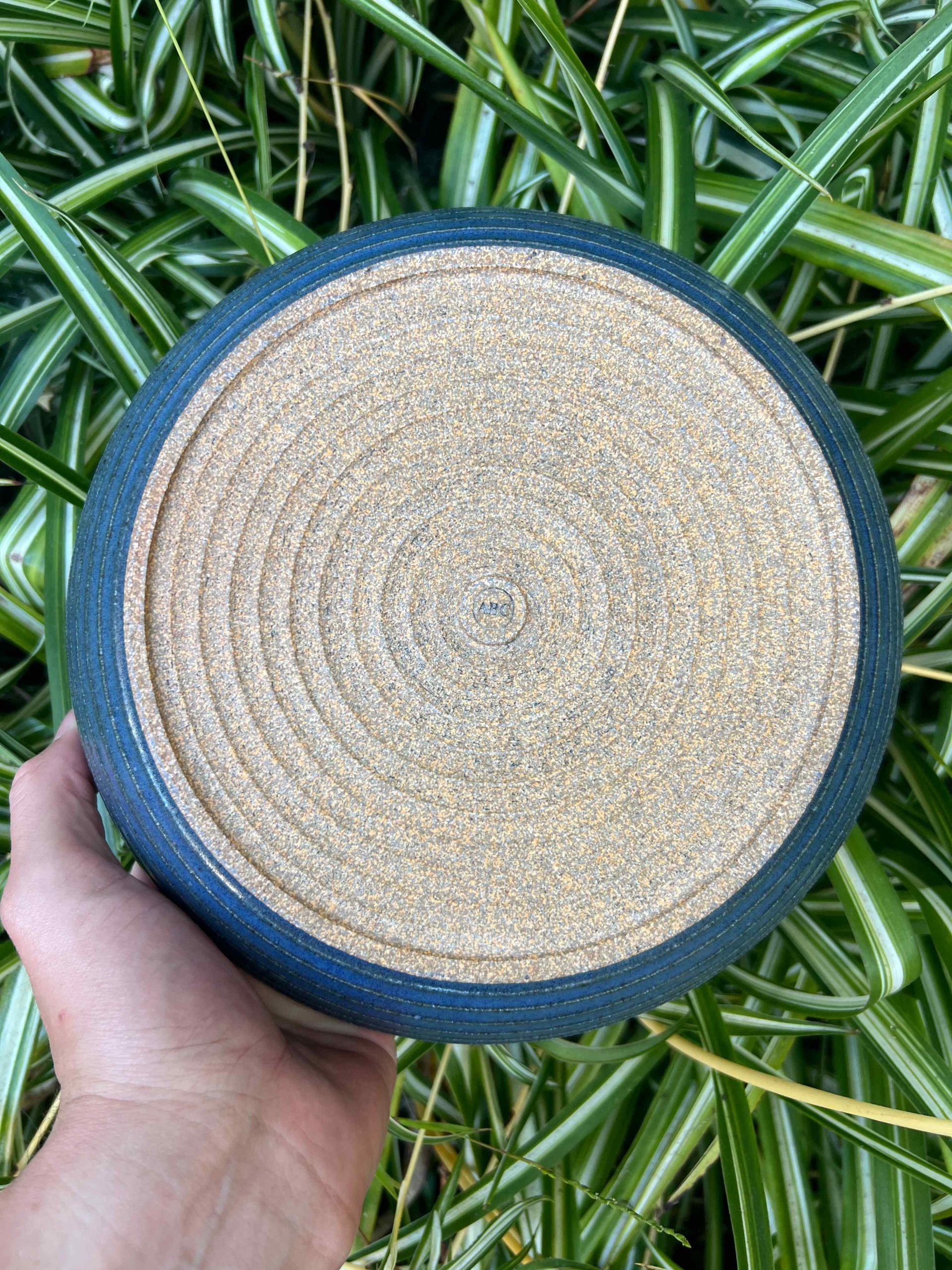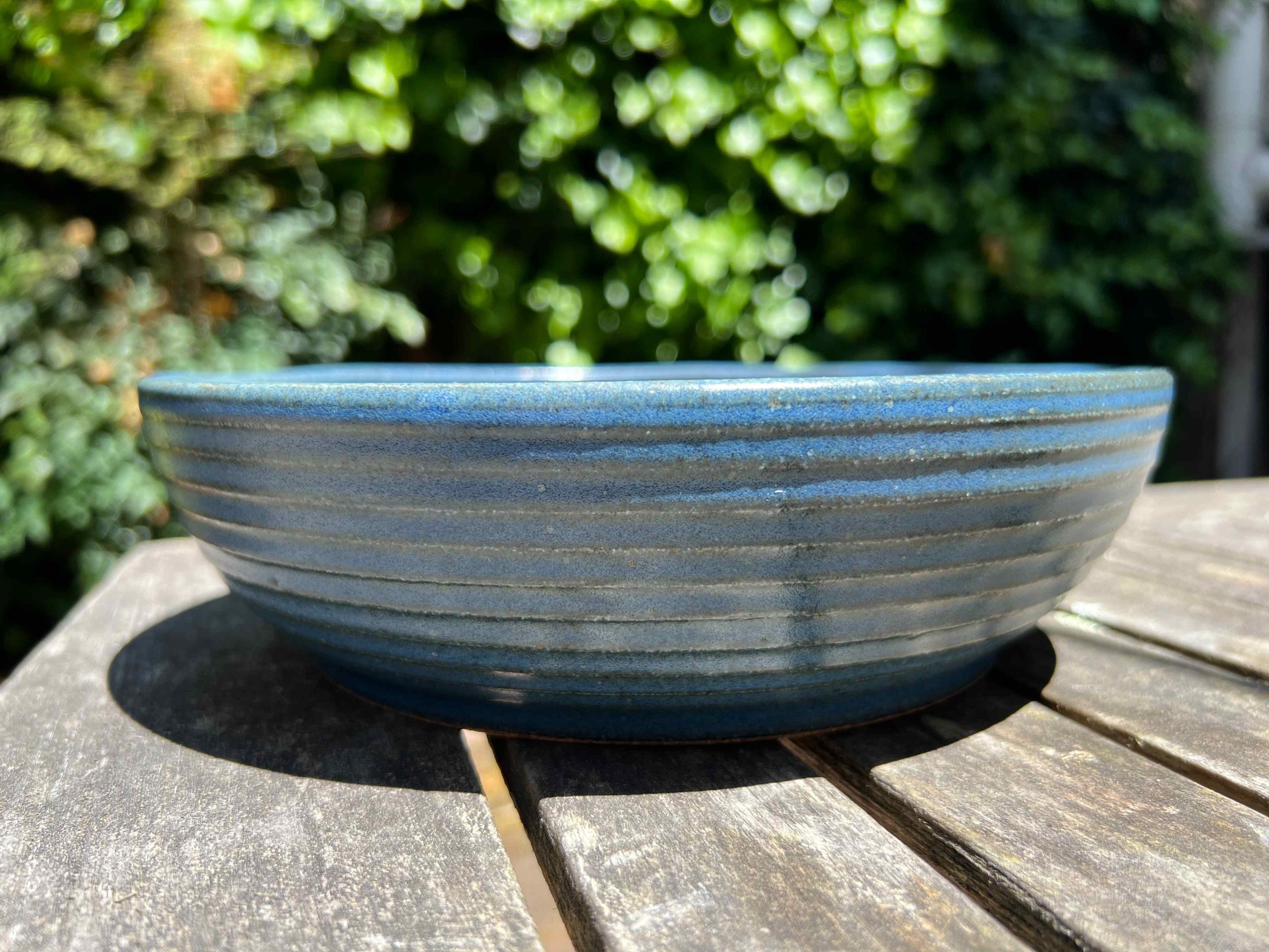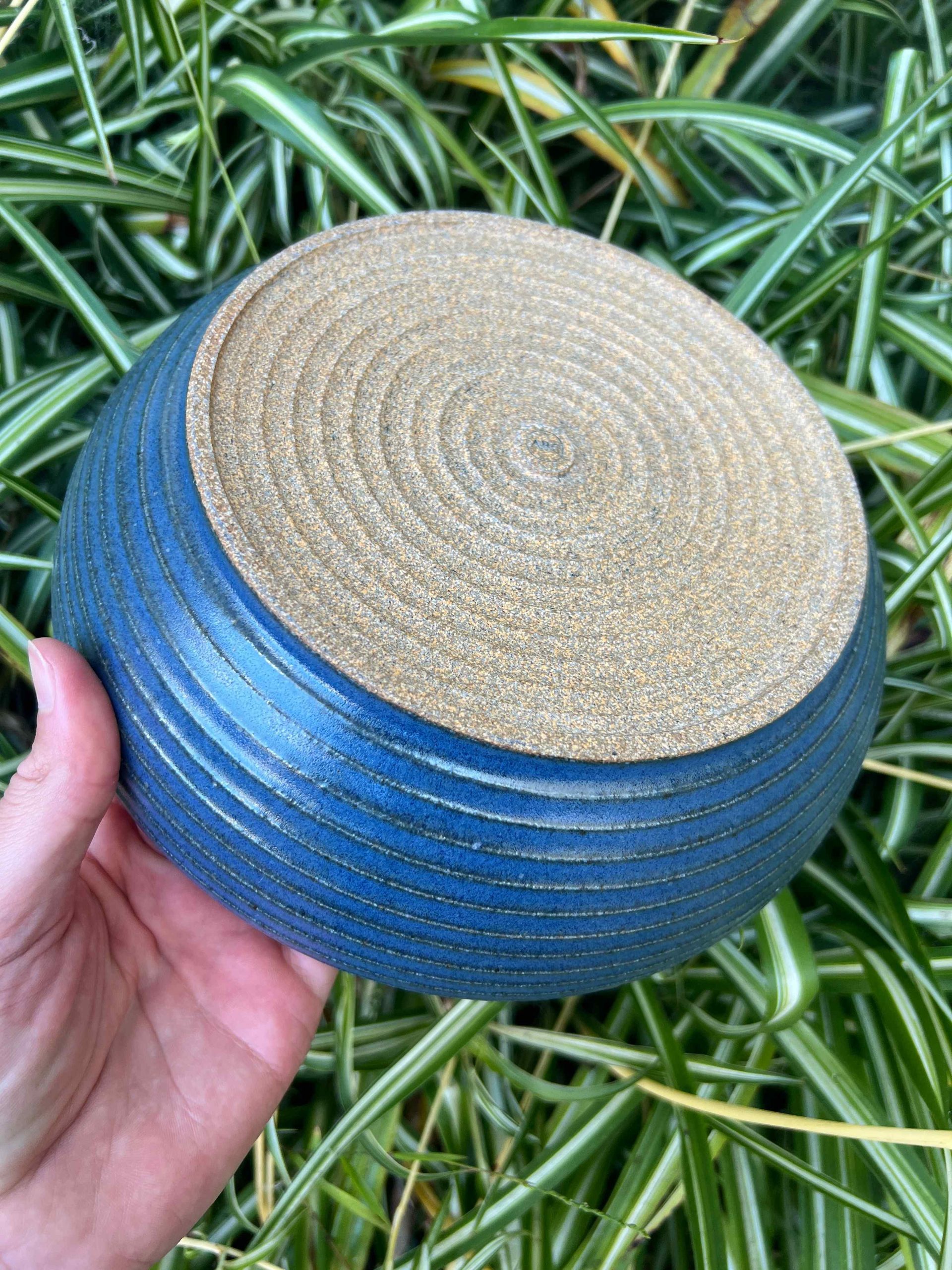 Our blue serving bowl is a great wide bowl for your next dinner party. The texture is added after the trimming process. The perfect piece for any kitchen.