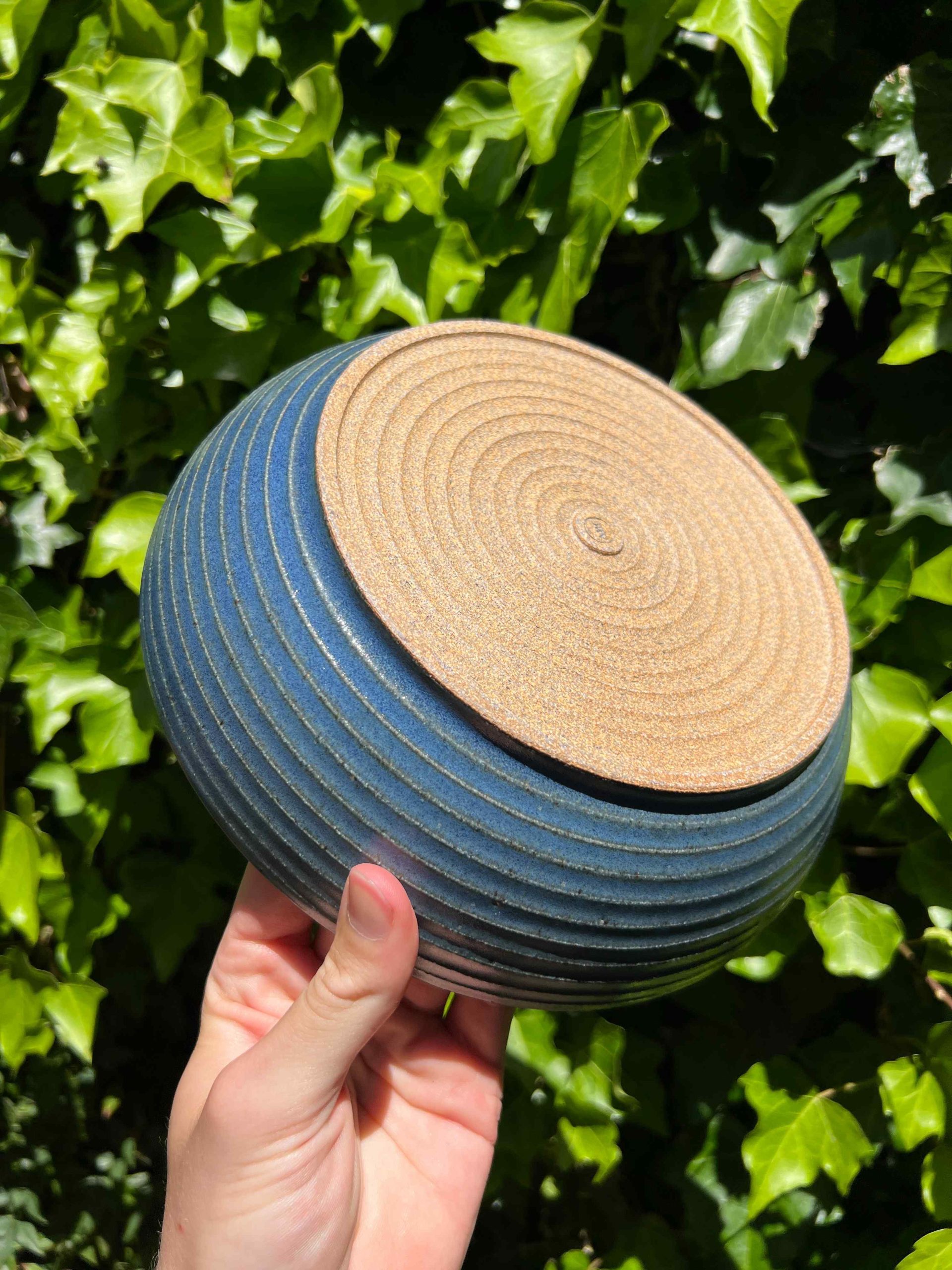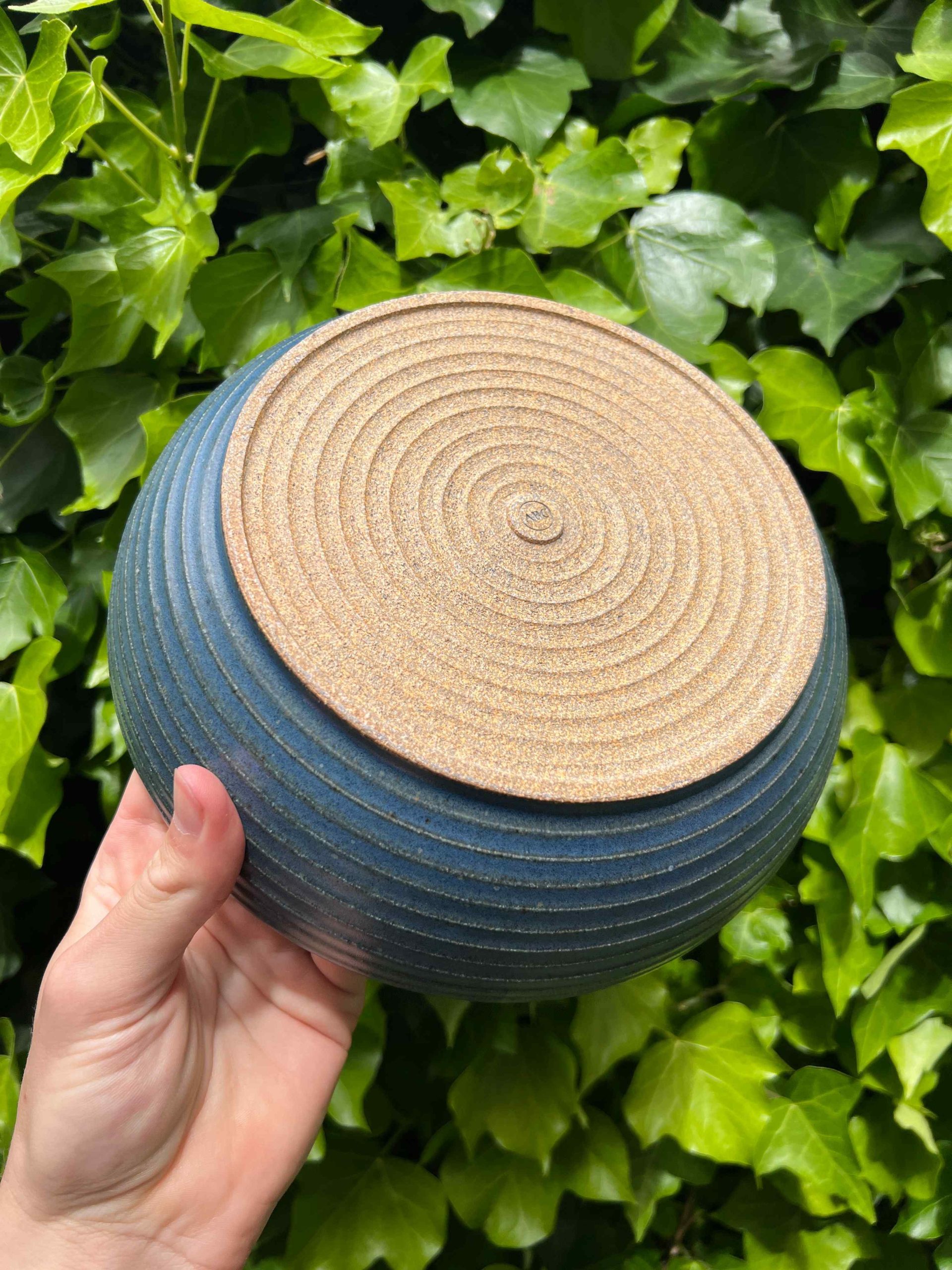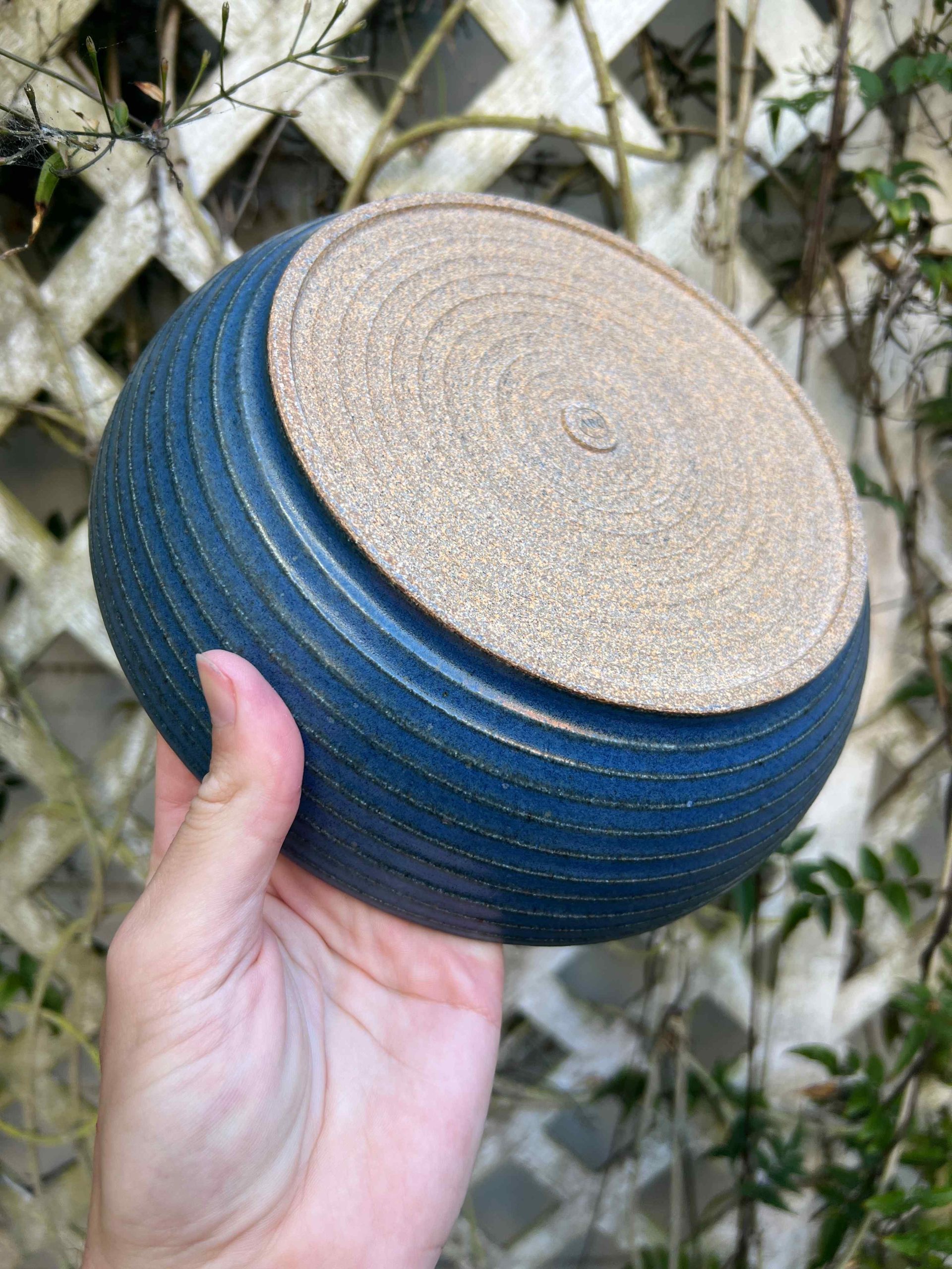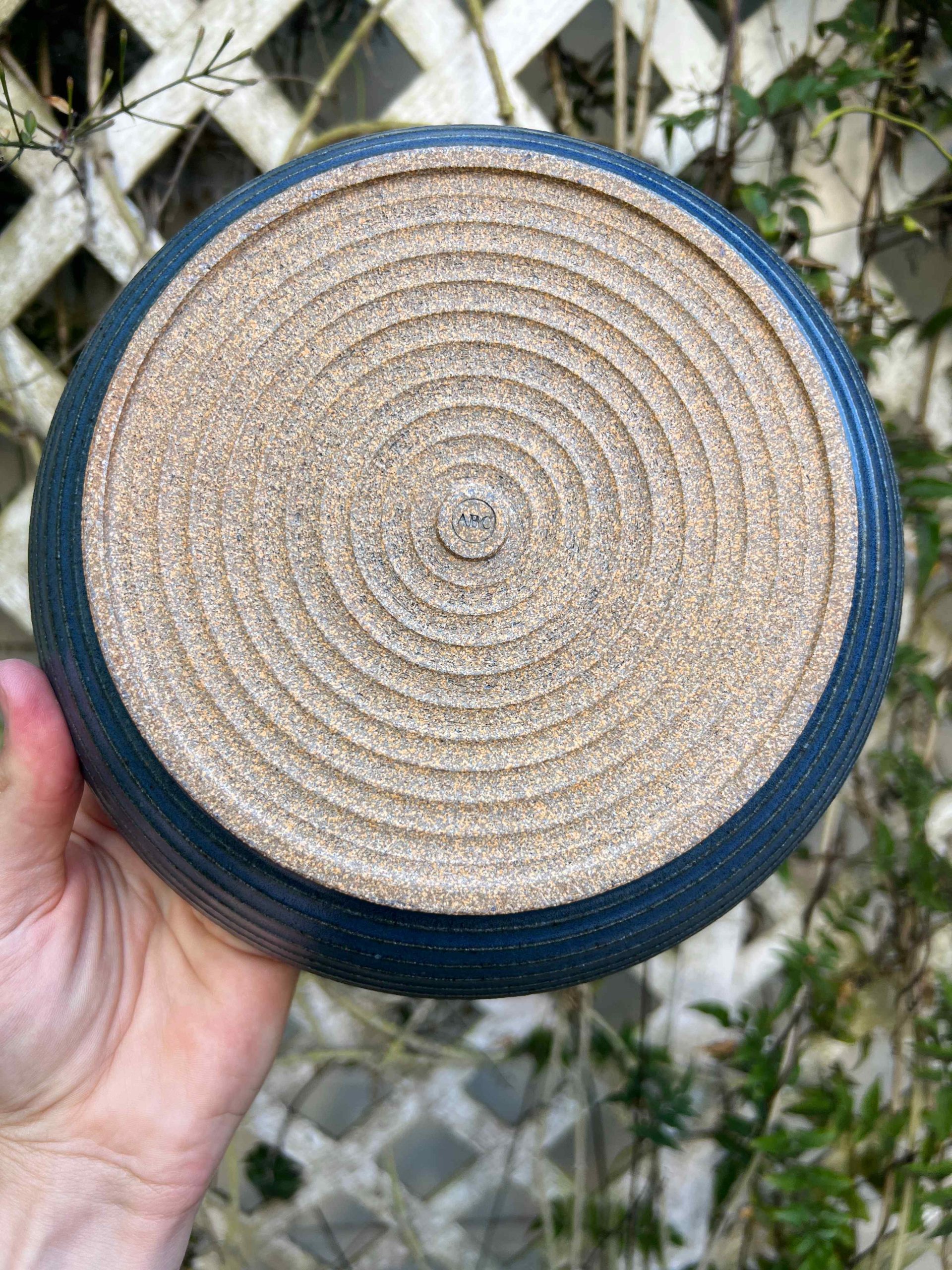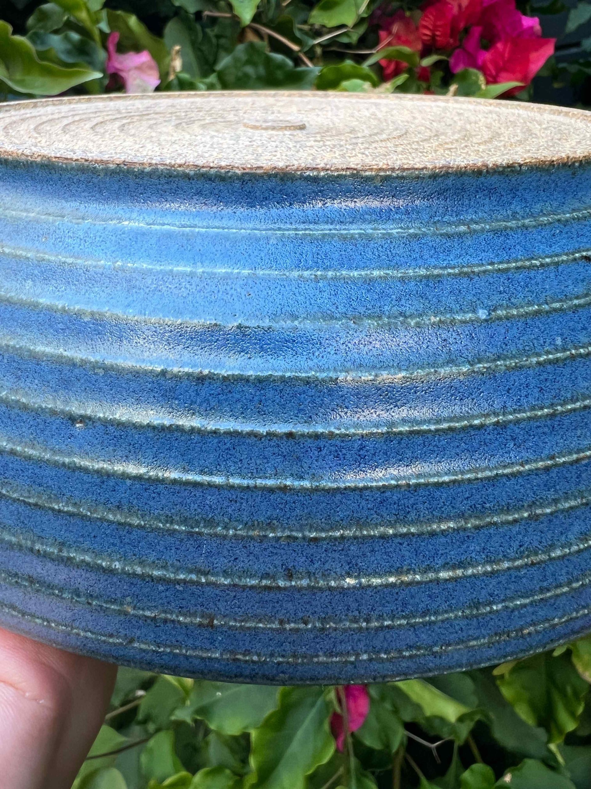 Our blue serving bowl is a great wide bowl for your next dinner party. The texture is added after the trimming process. The perfect piece for any kitchen.