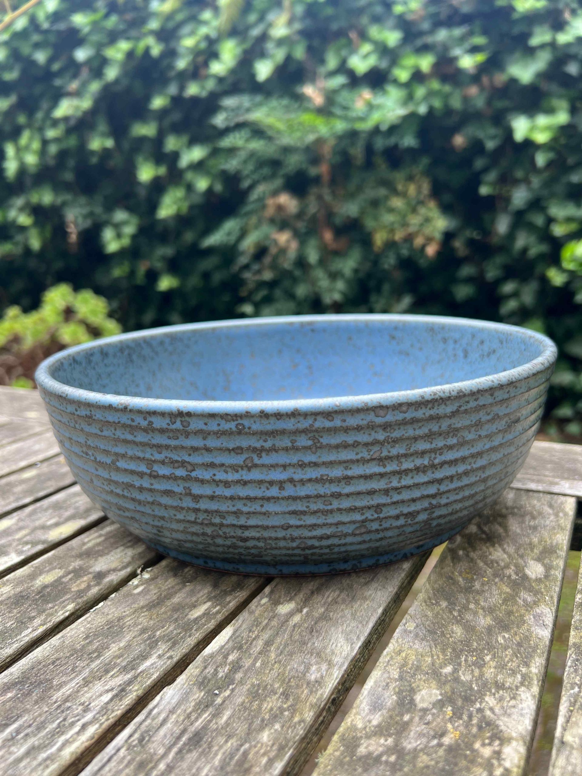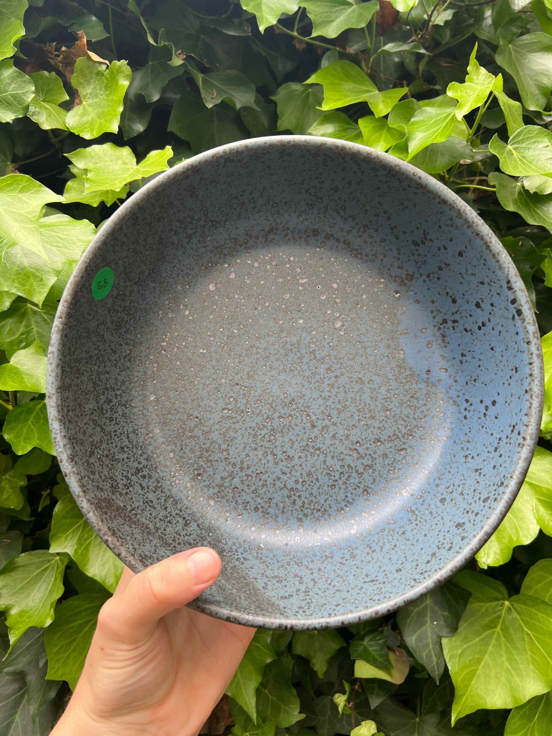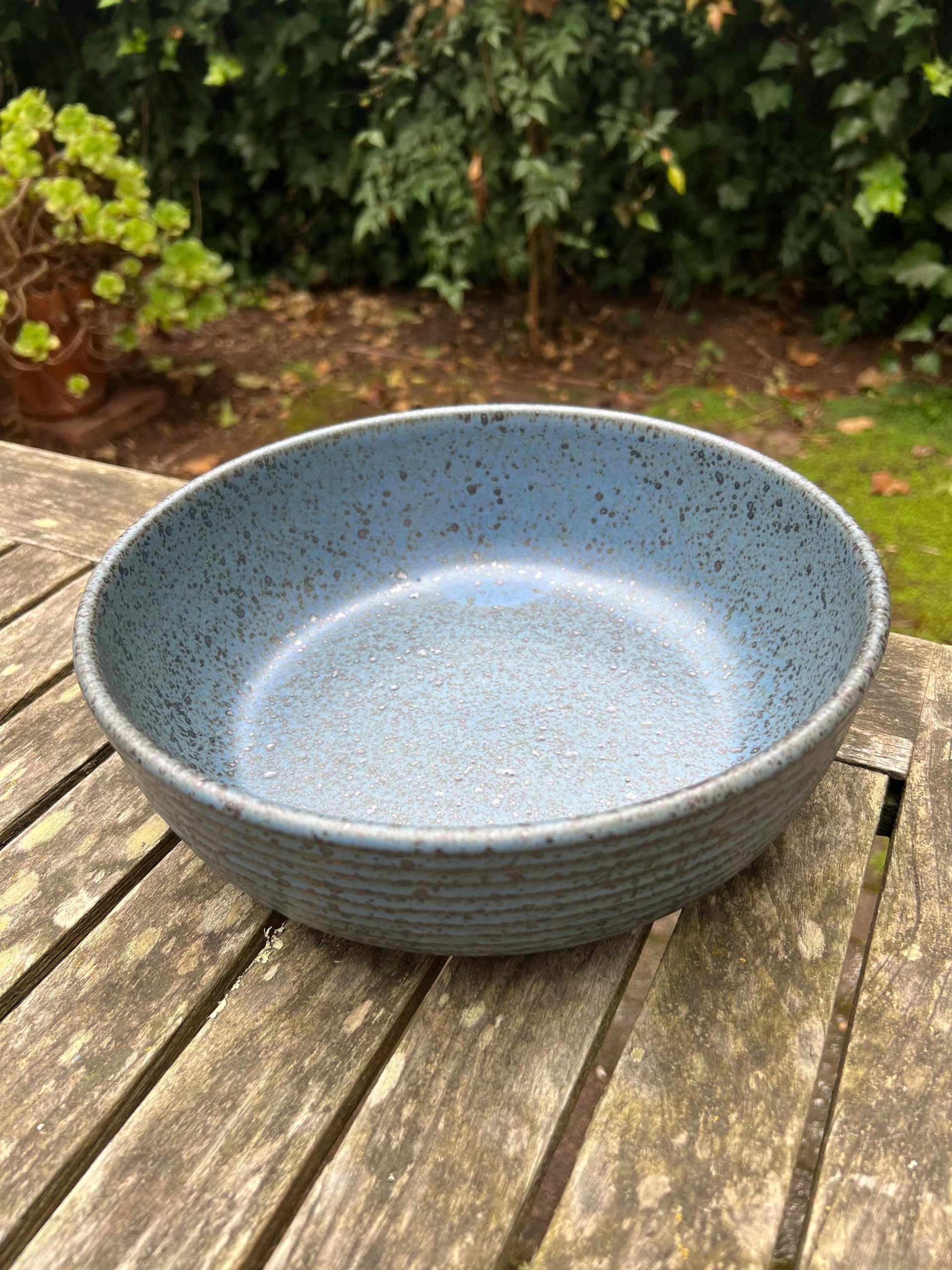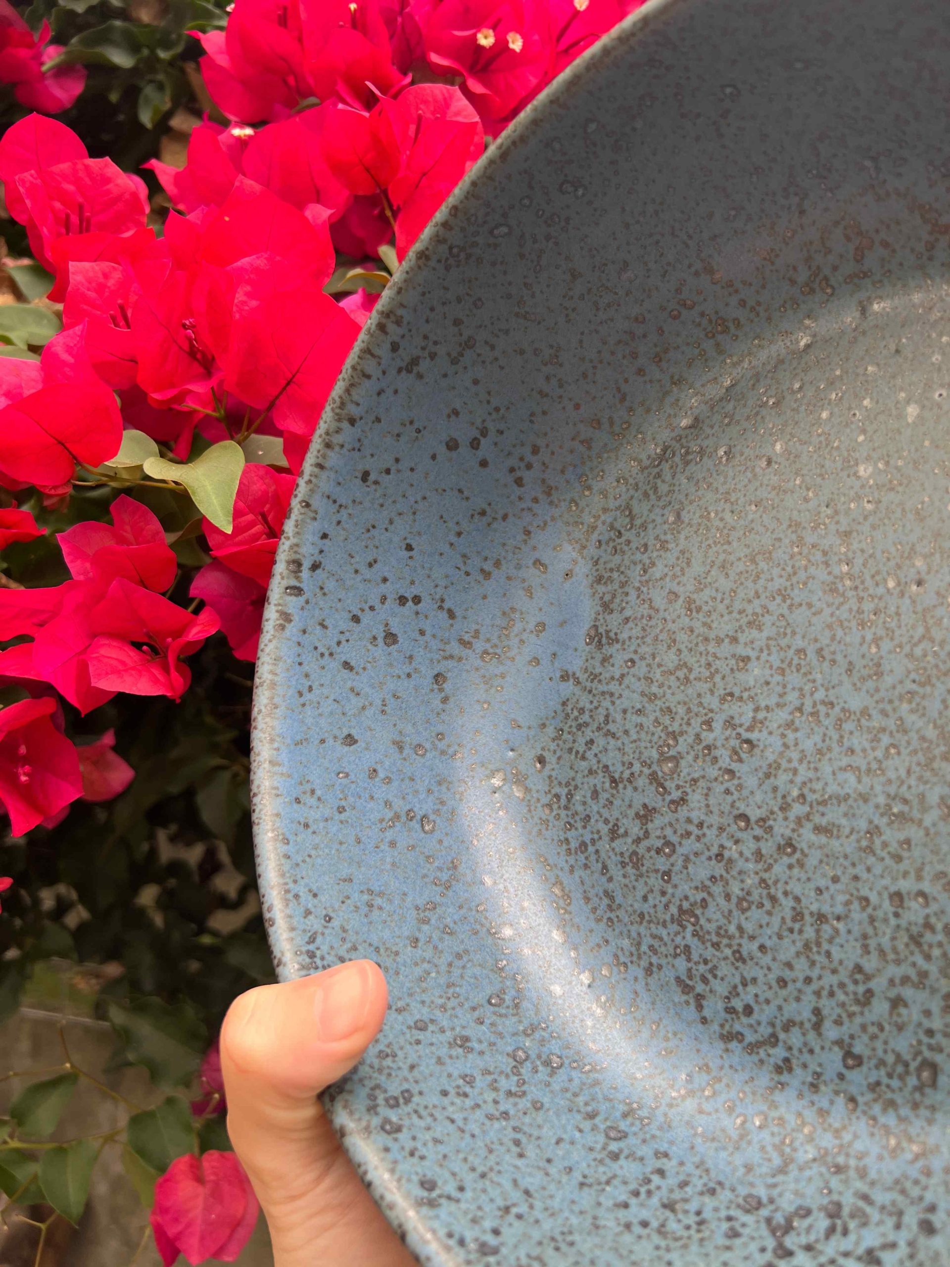 Our blue speckle serving bowl is a great wide bowl for your next dinner party. The texture is added after the trimming process. The perfect piece for any kitchen.