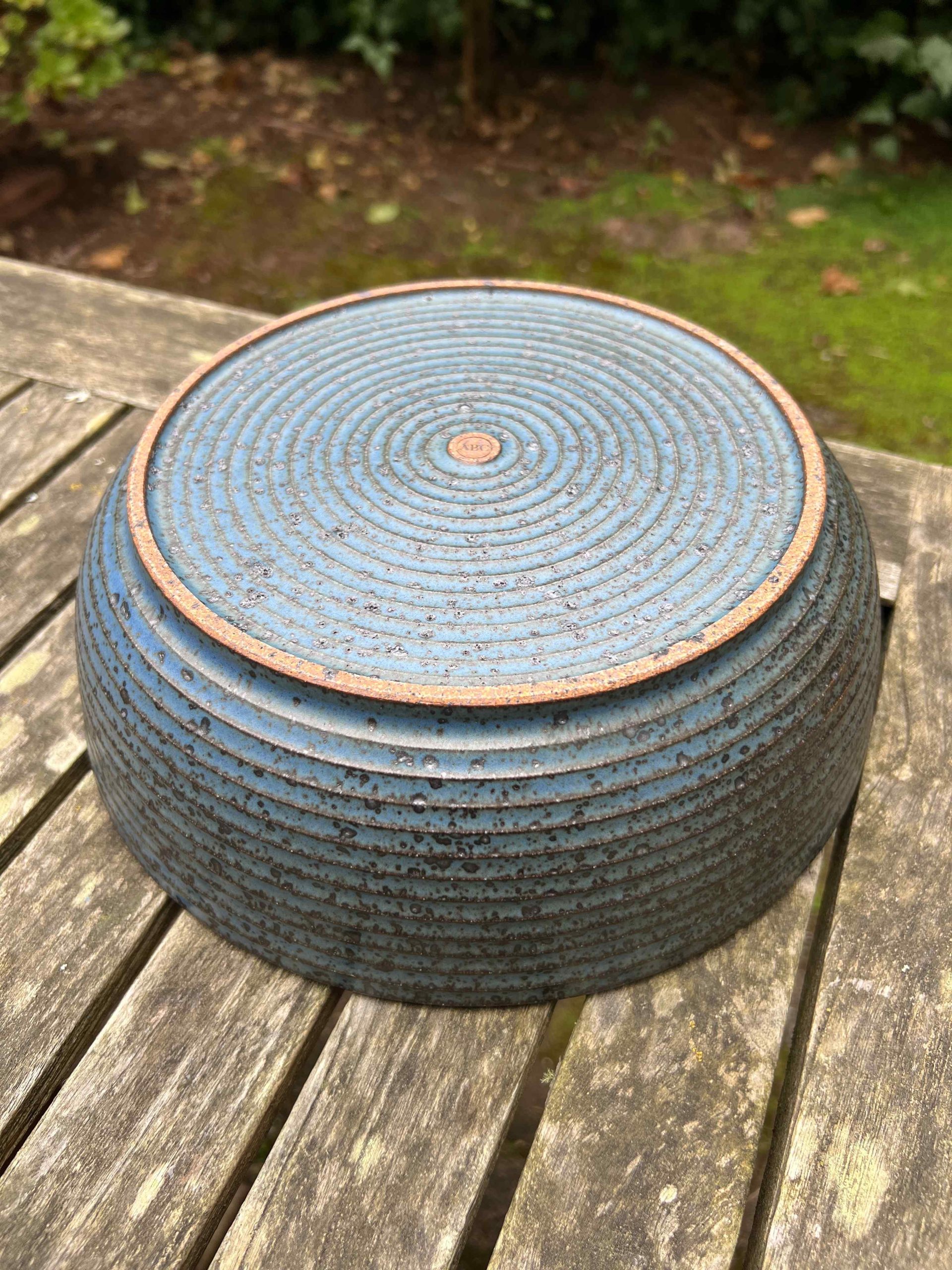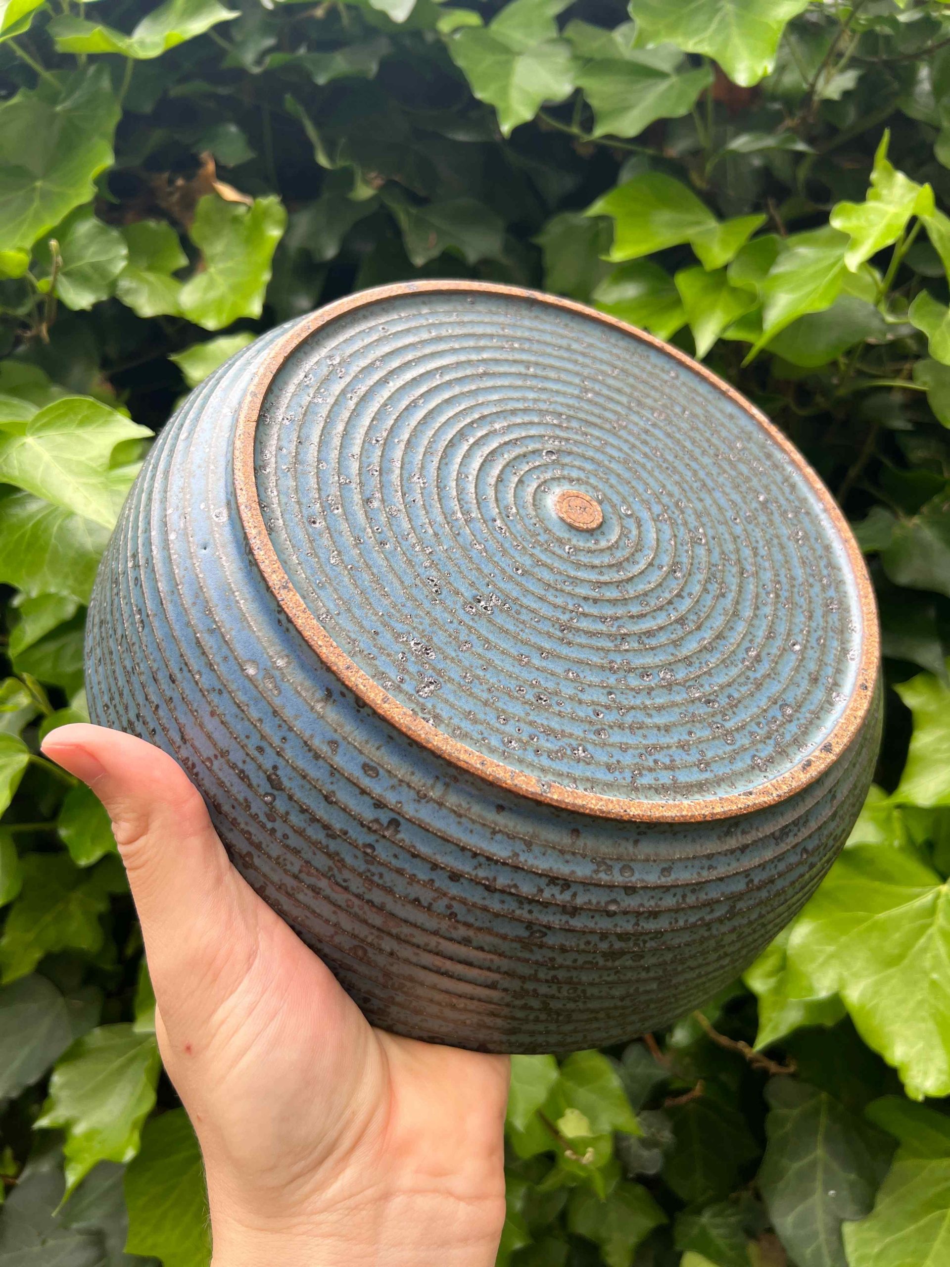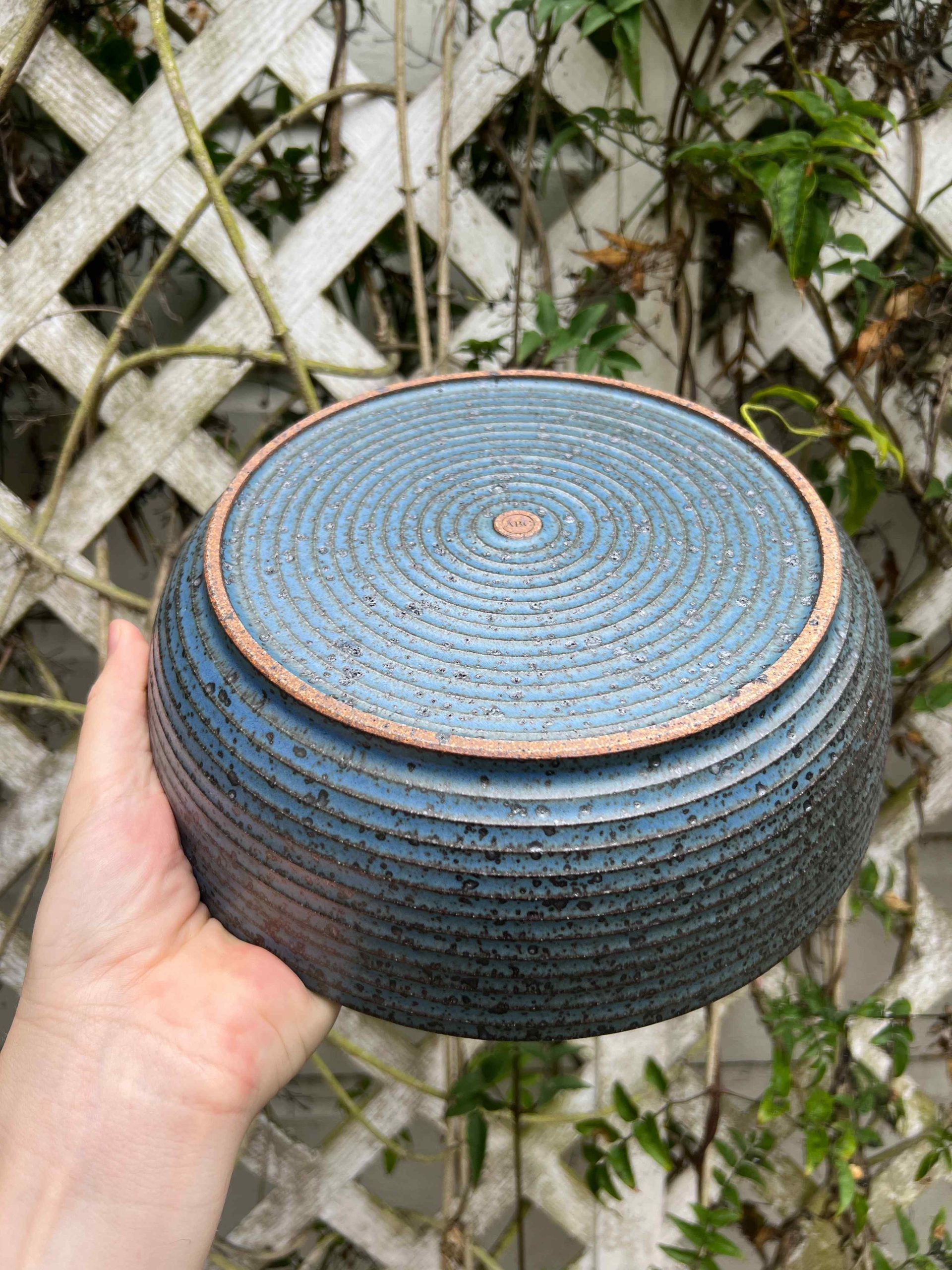 Our blue speckle serving bowl is a great wide bowl for your next dinner party. The texture is added after the trimming process. The perfect piece for any kitchen.