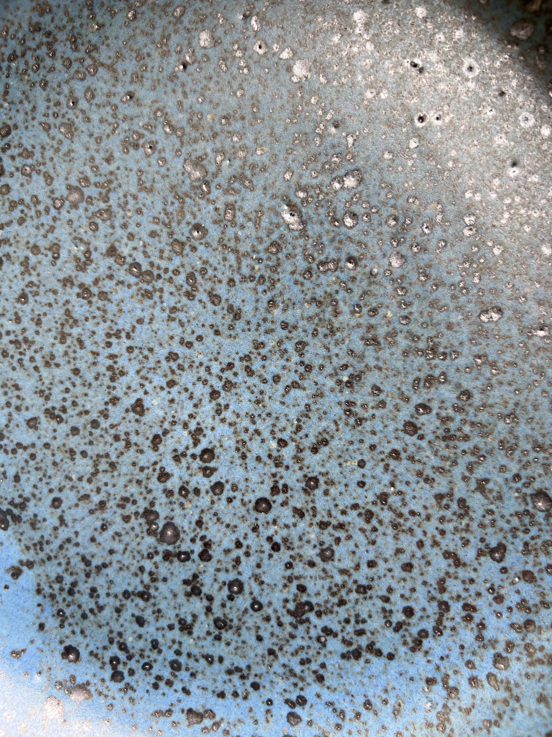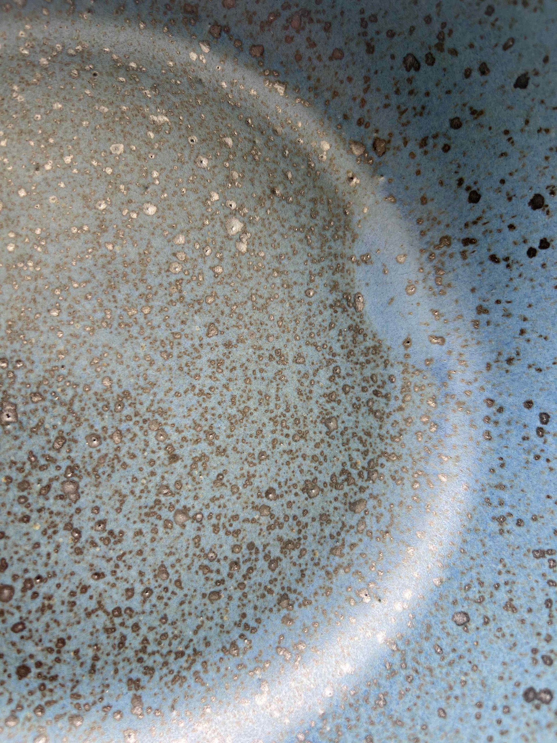 This bowl is considered a second. The iron in the clay usually completely melts but in areas on this bowl it has a little bit of a texture, almost like pinholing. Technically not food safe, but I would still use it for food.