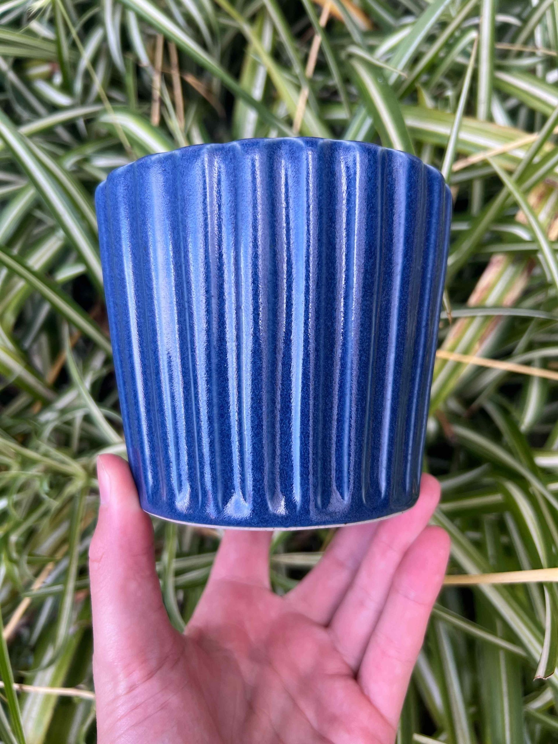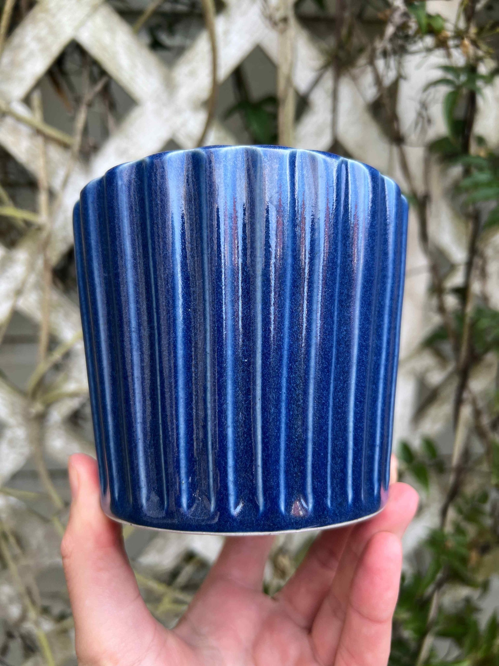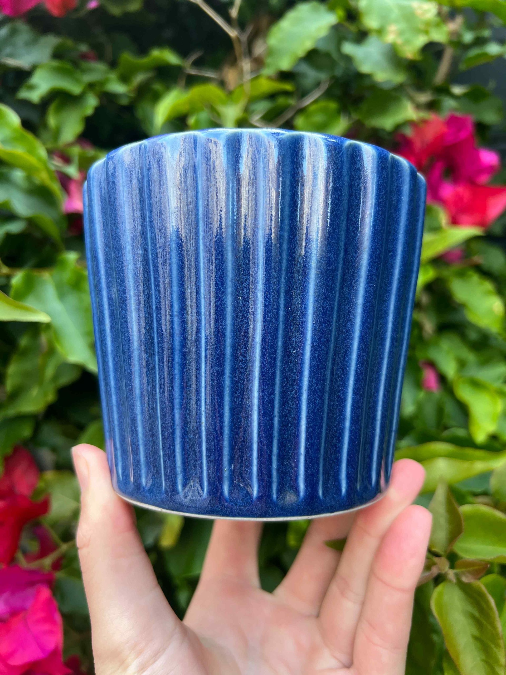 Our Dark Blue Faceted Planter has a blue exterior with a vertical stripe pattern. Perfect indoor or outdoor planter for your beautiful home