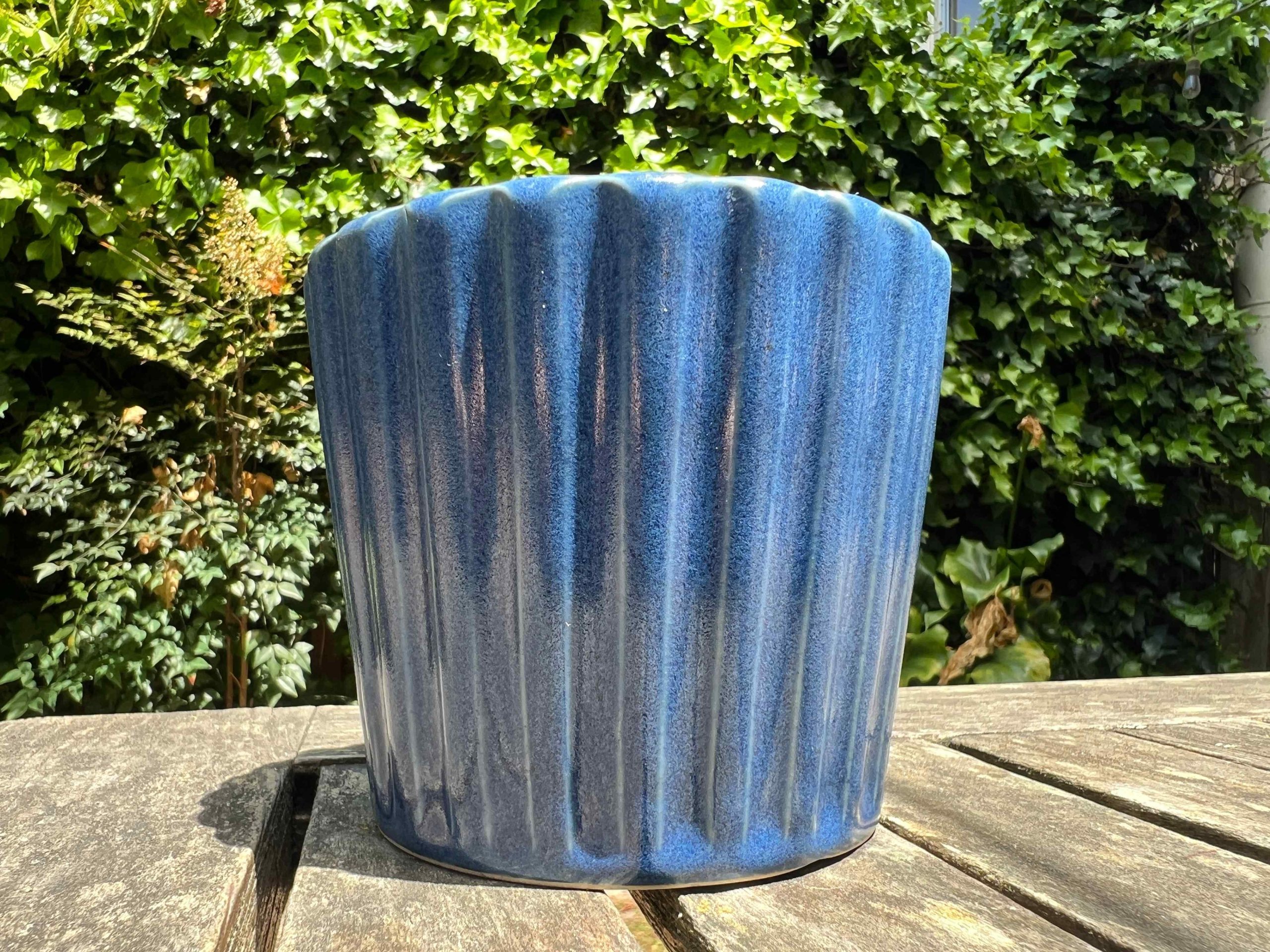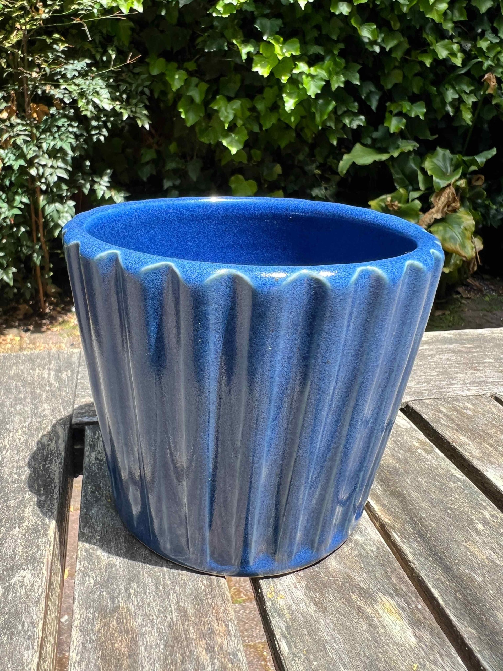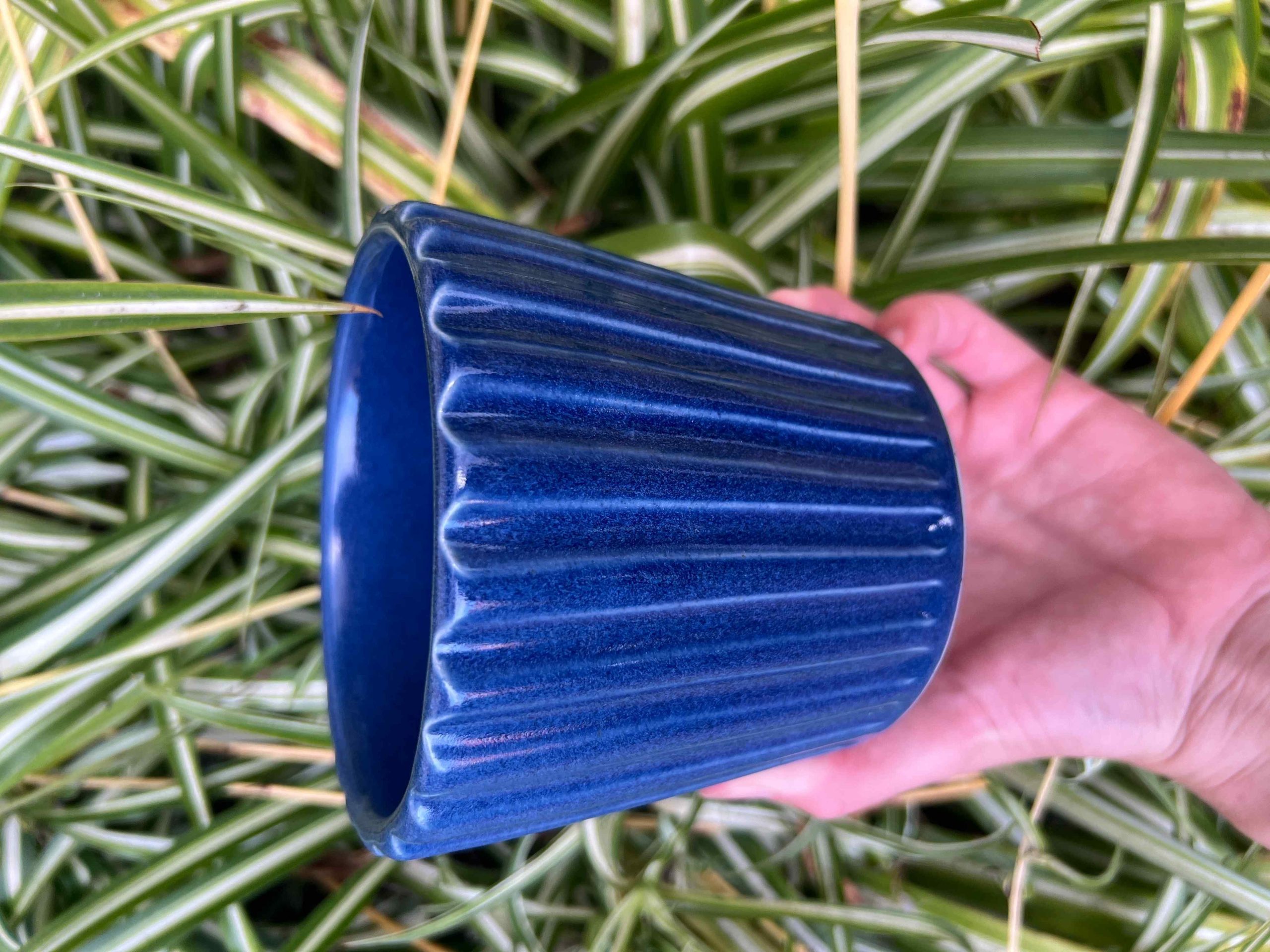 Our Dark Blue Faceted Planter has a blue exterior with a vertical stripe pattern. Perfect indoor or outdoor planter for your beautiful home