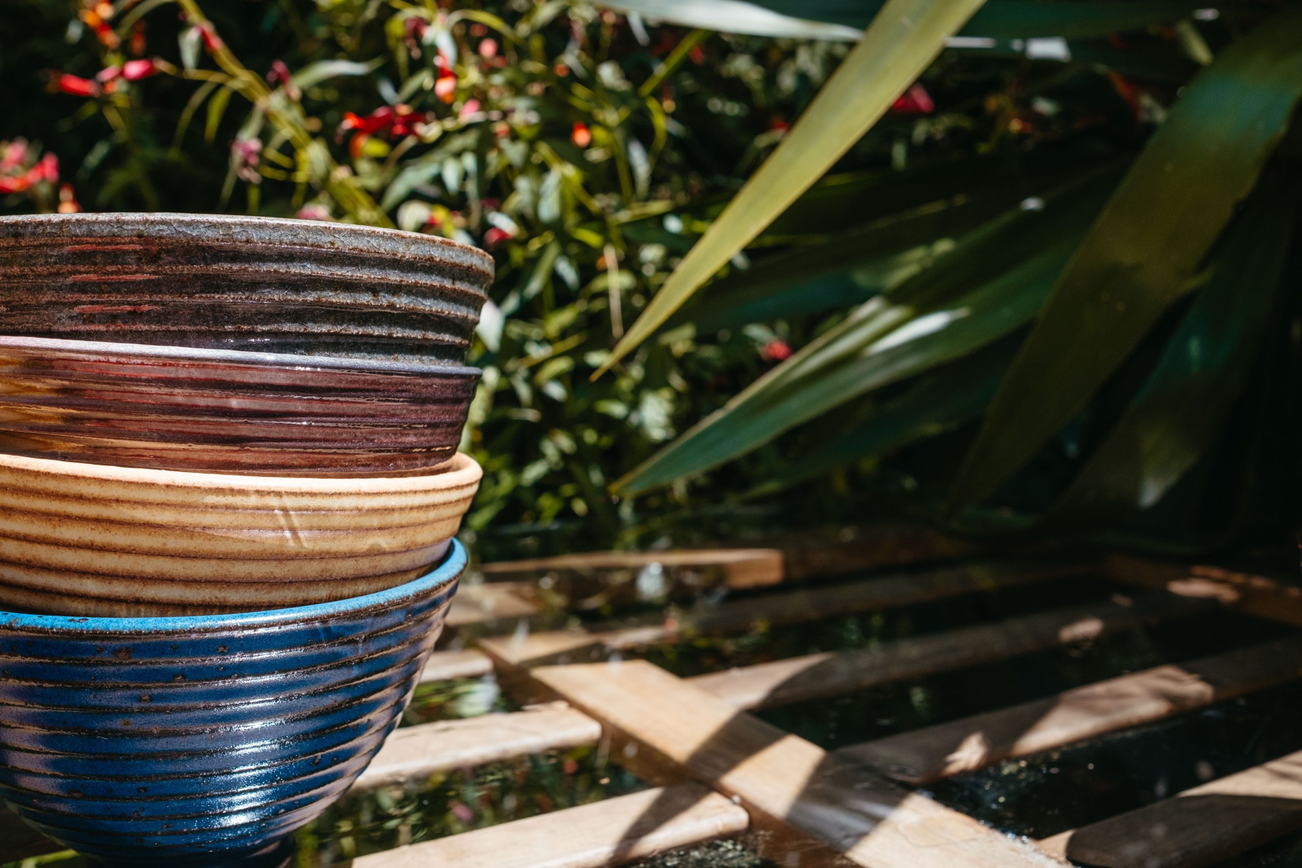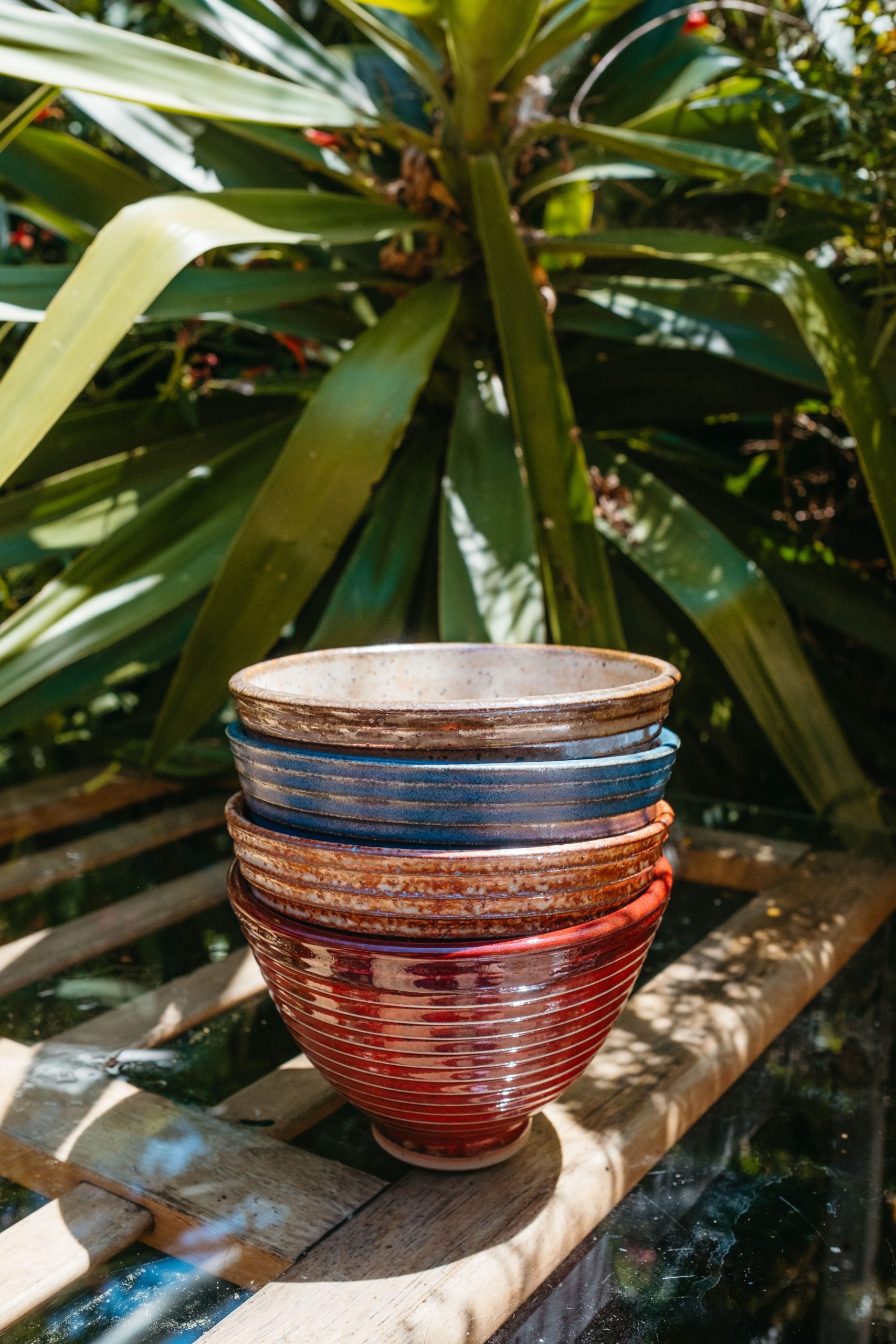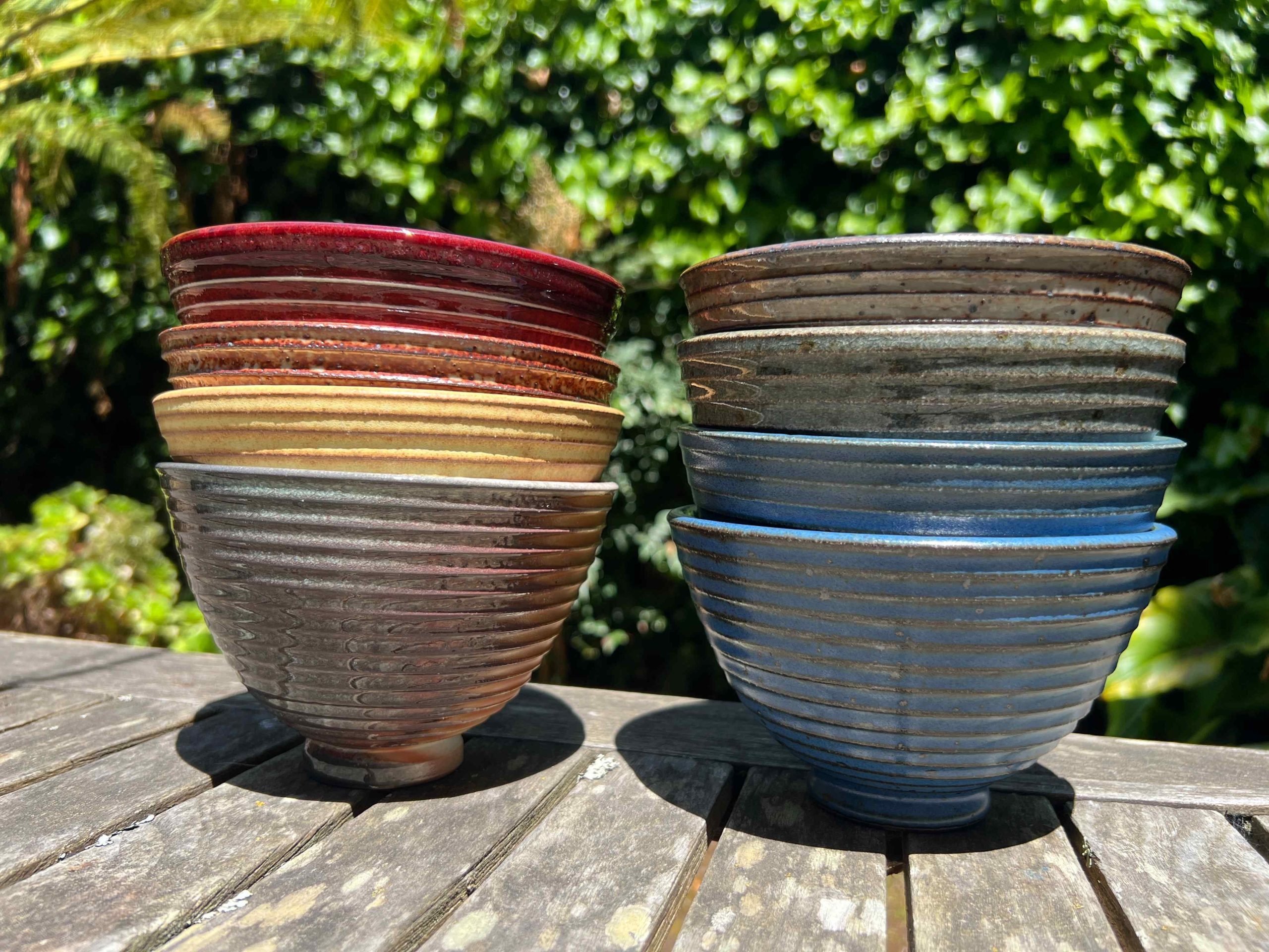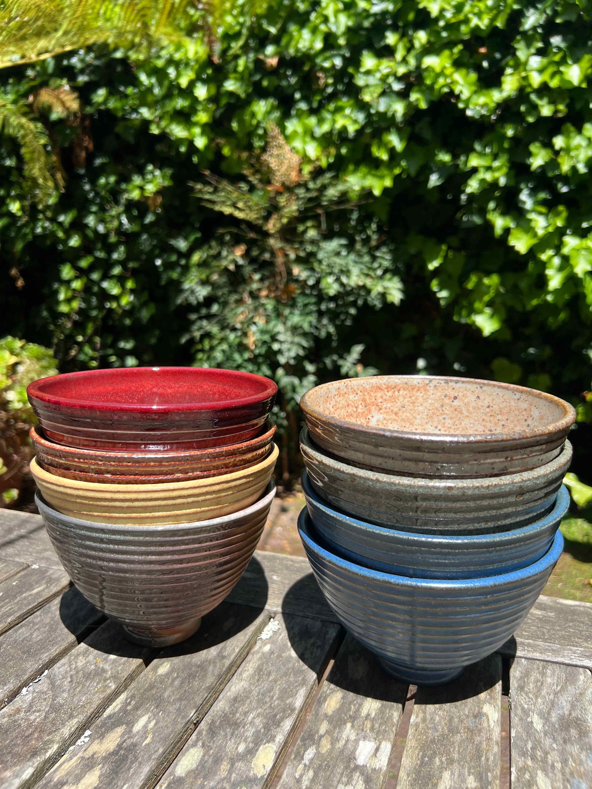Everyday bowls are 4 inches tall and 6 inches wide and come with the stripe texture and your choice of color.