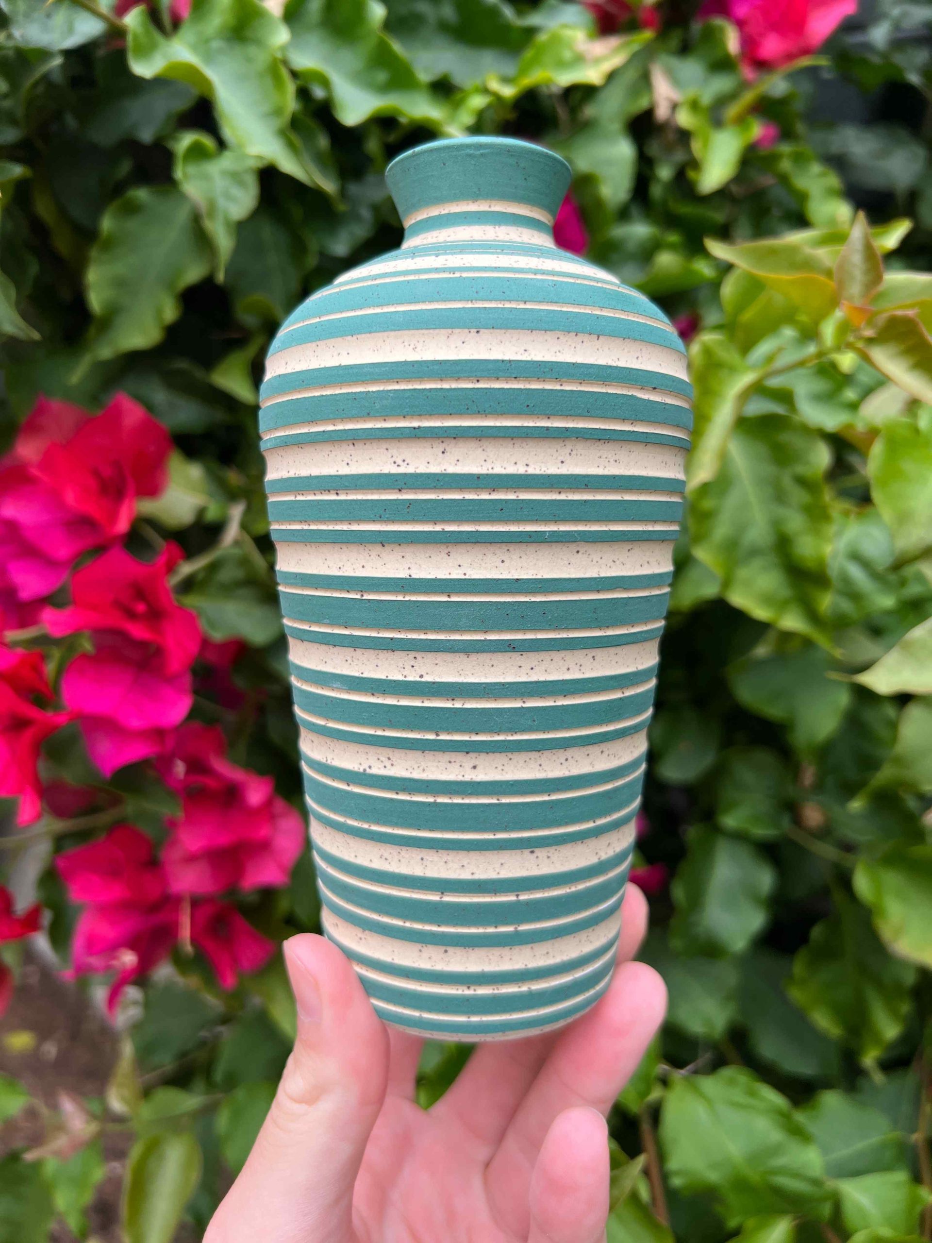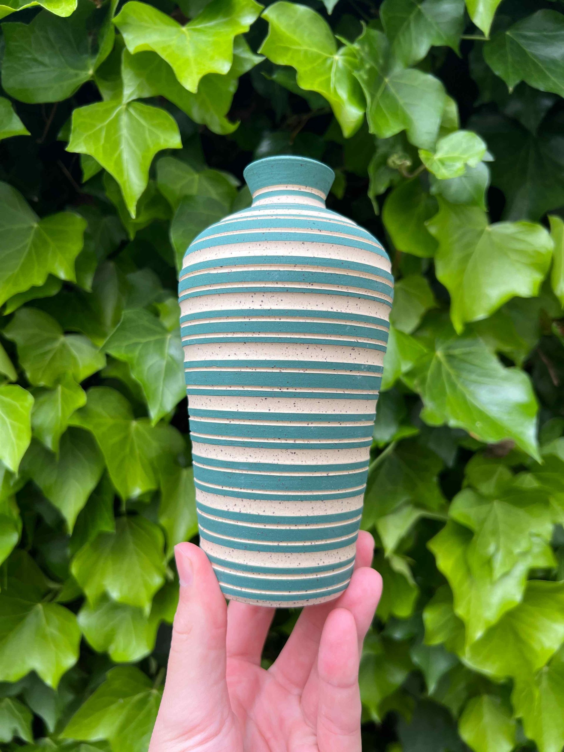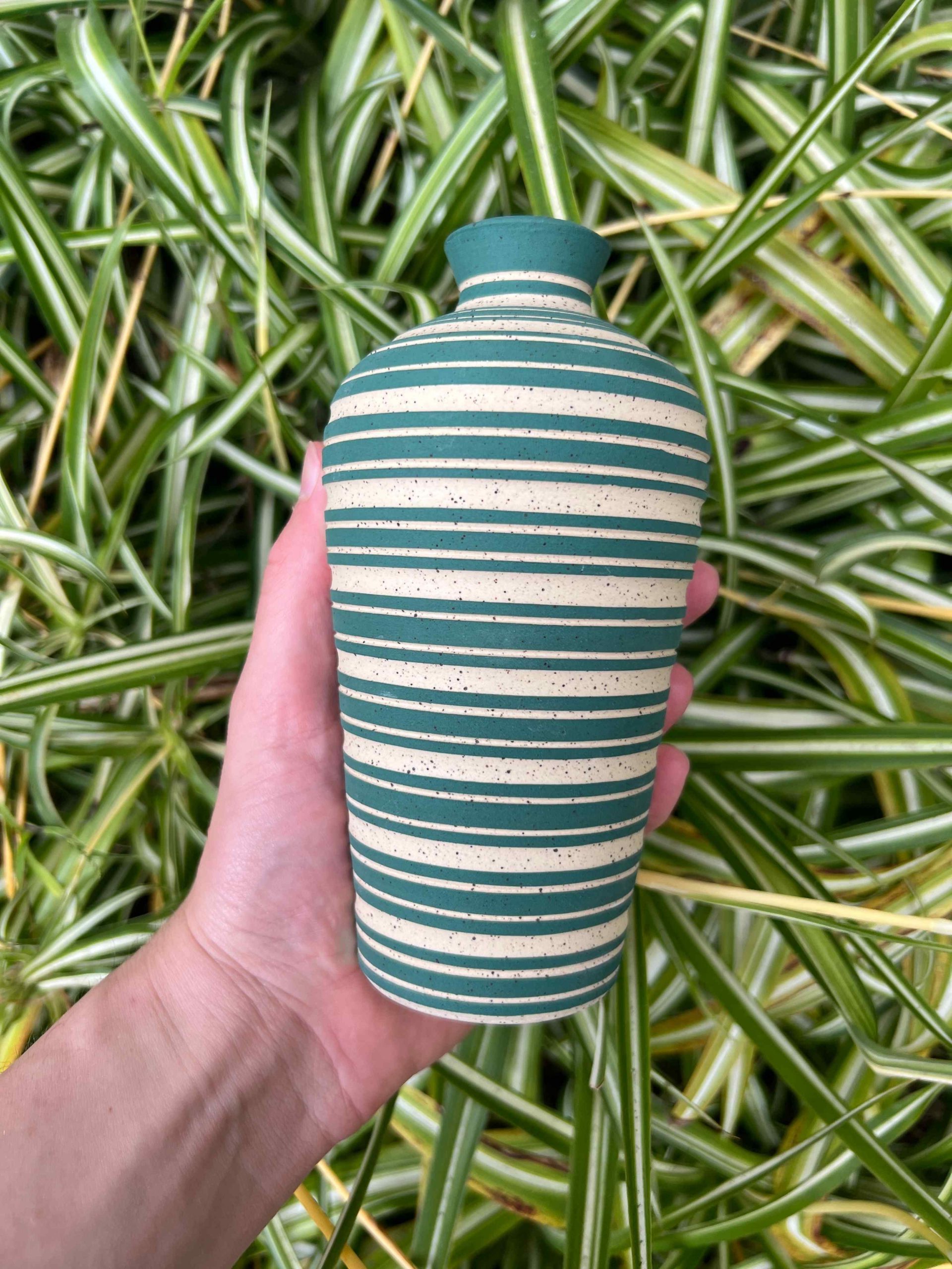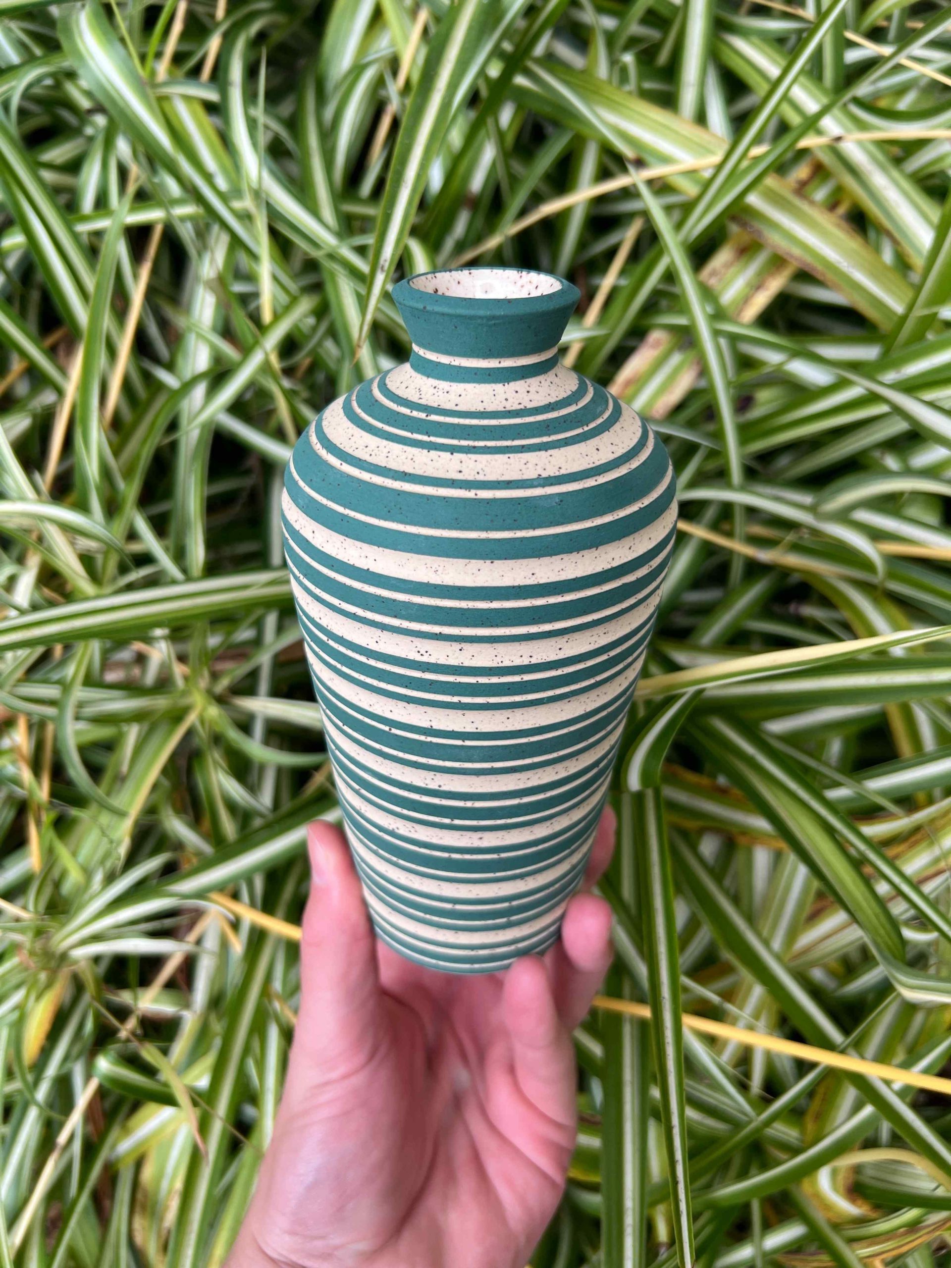 A great piece for the home, the Green Striped Bud Vase has a unique striped pattern that enhances the shape around the outside.