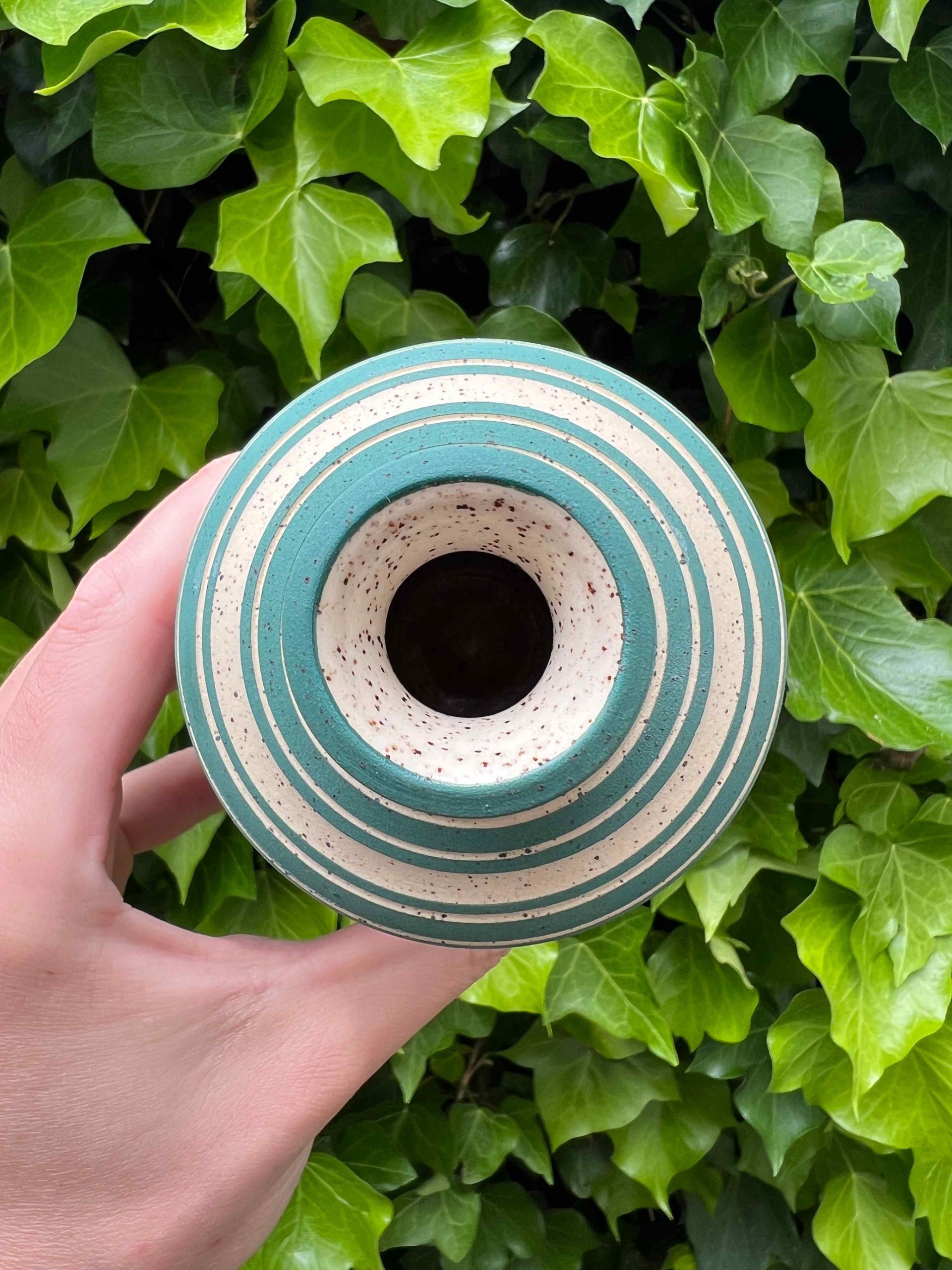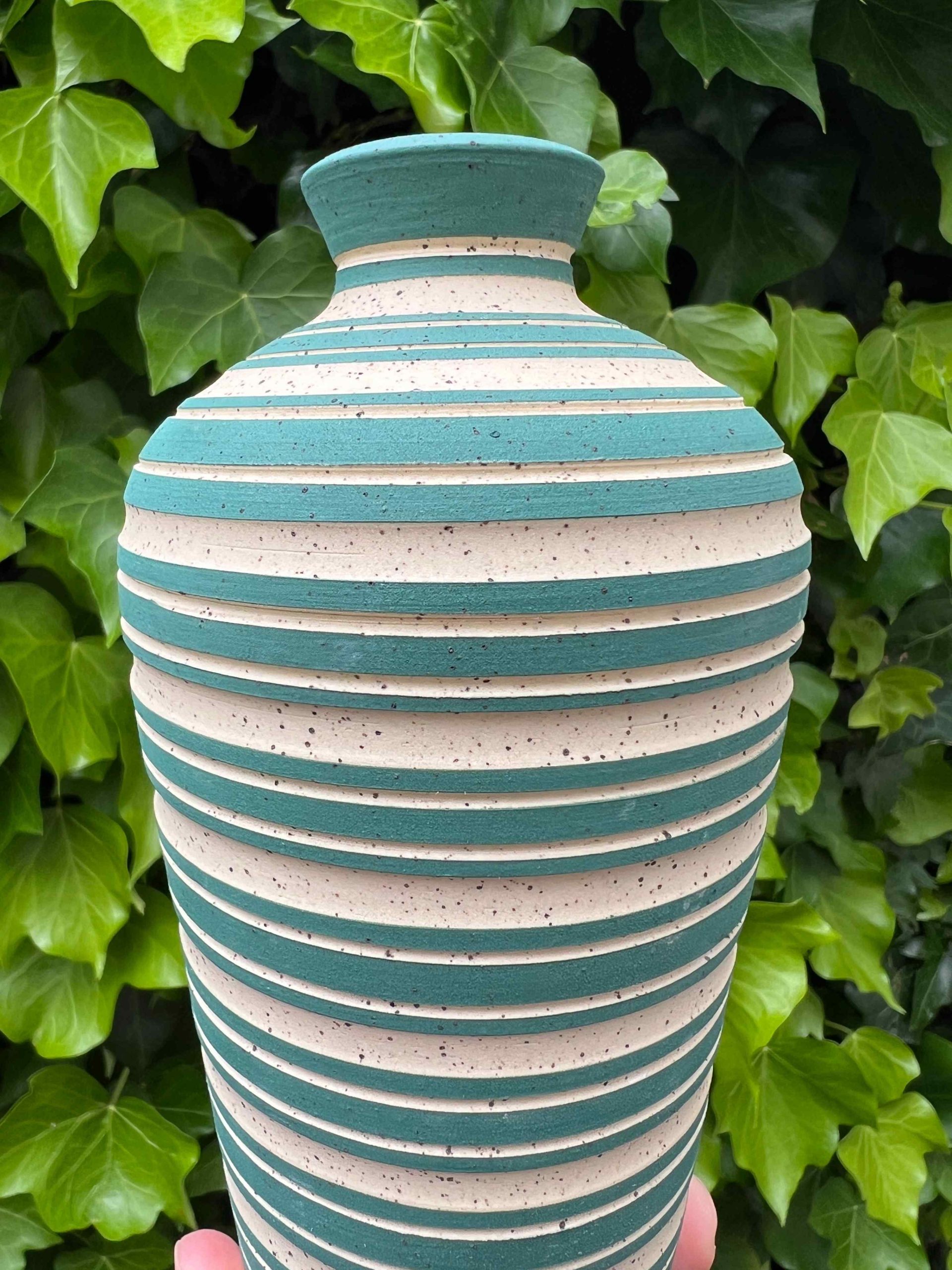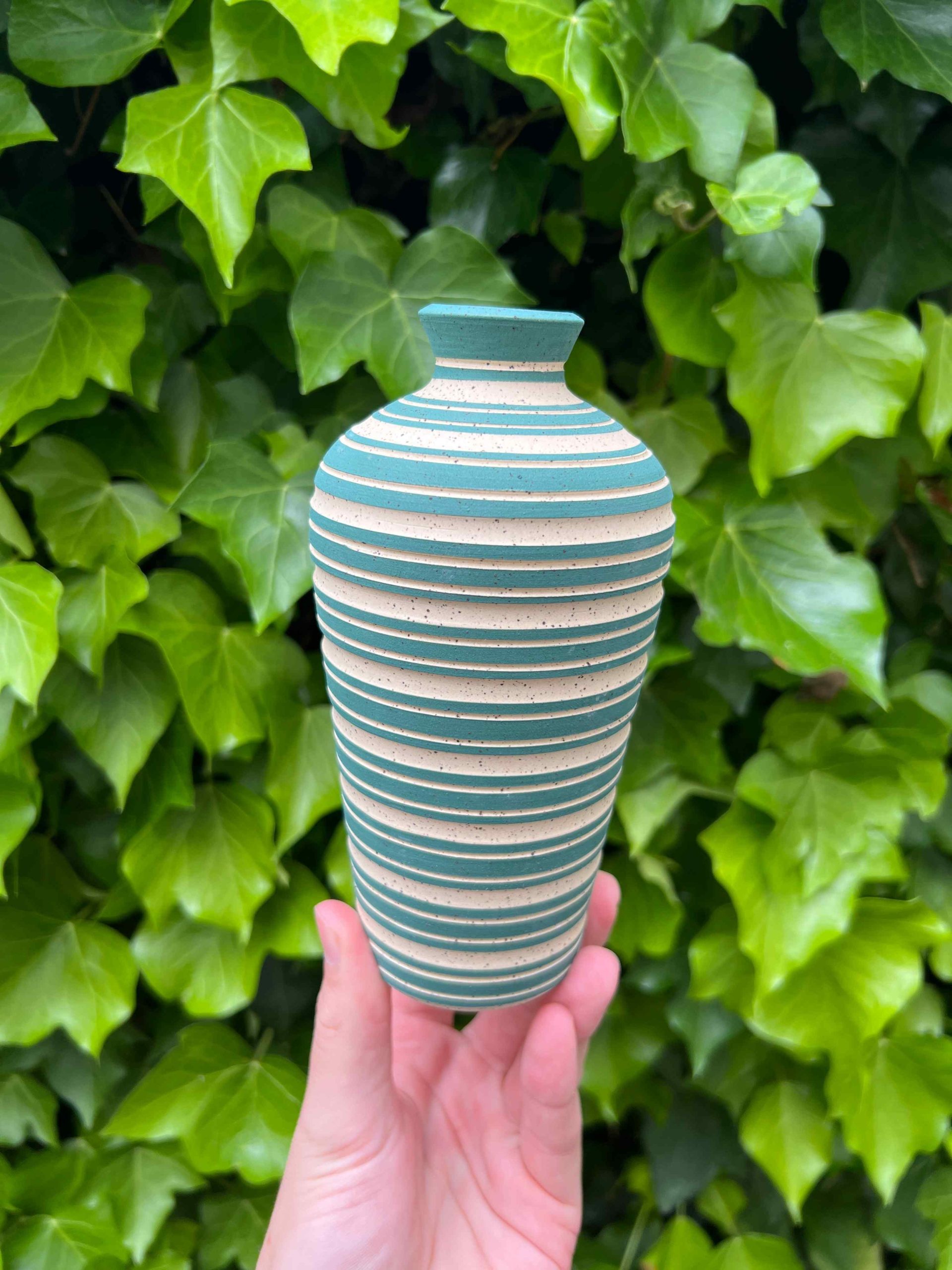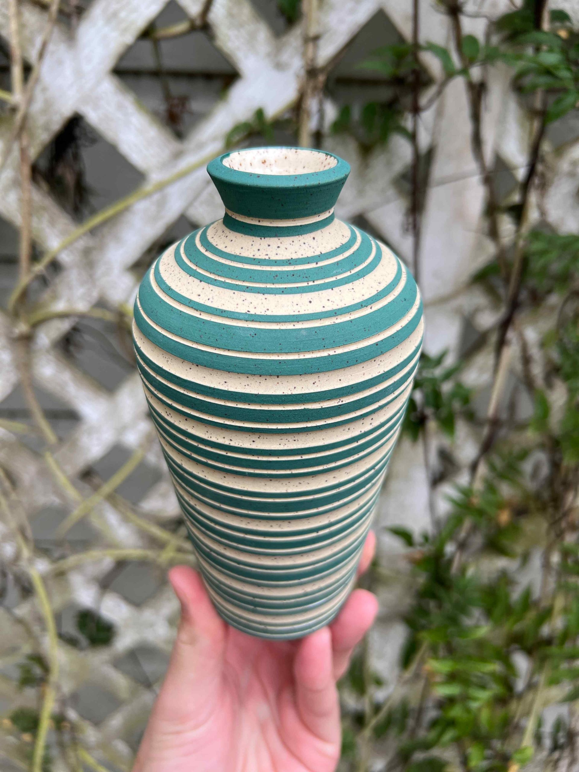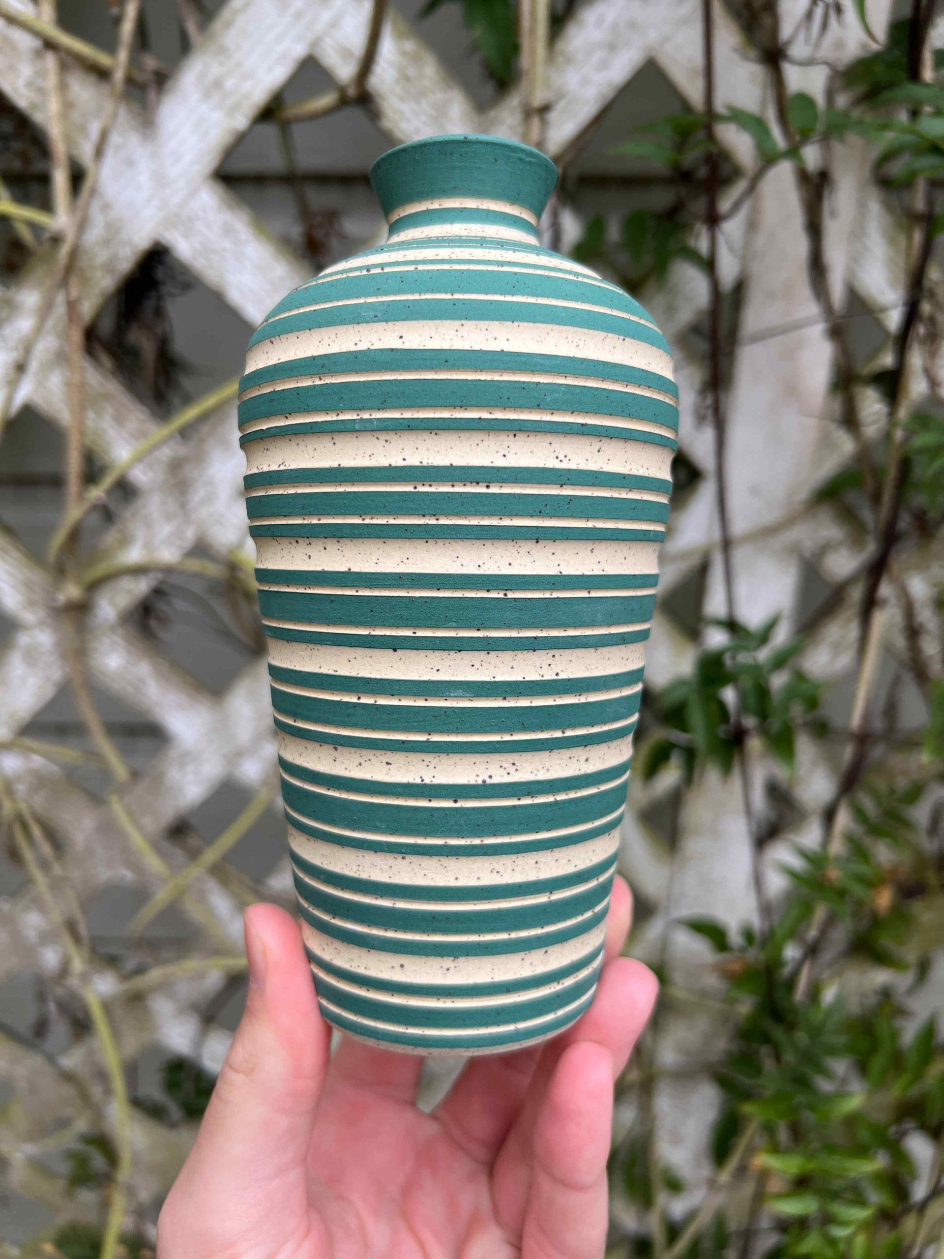 A great piece for the home, the Green Striped Bud Vase has a unique striped pattern that enhances the shape around the outside.