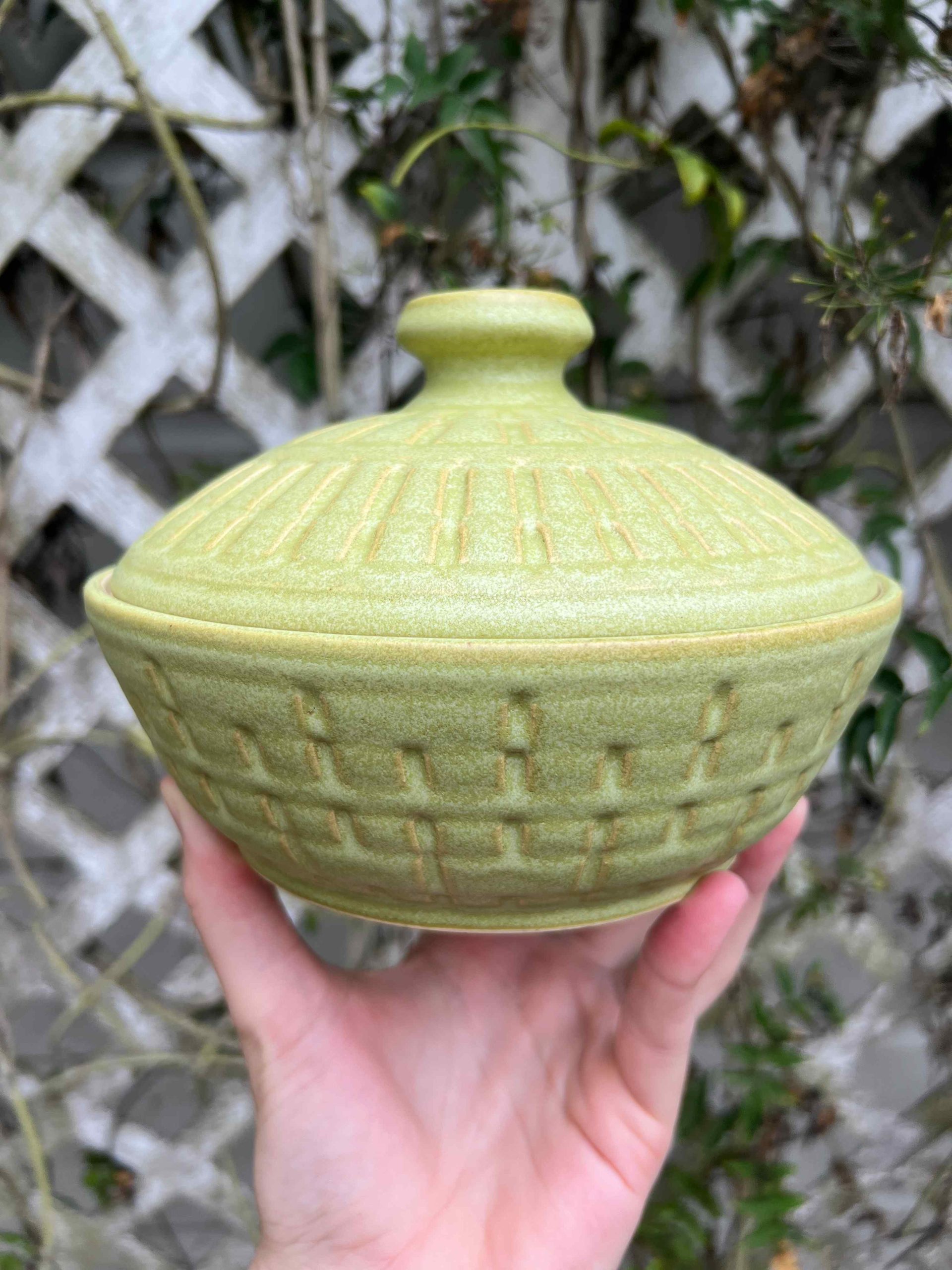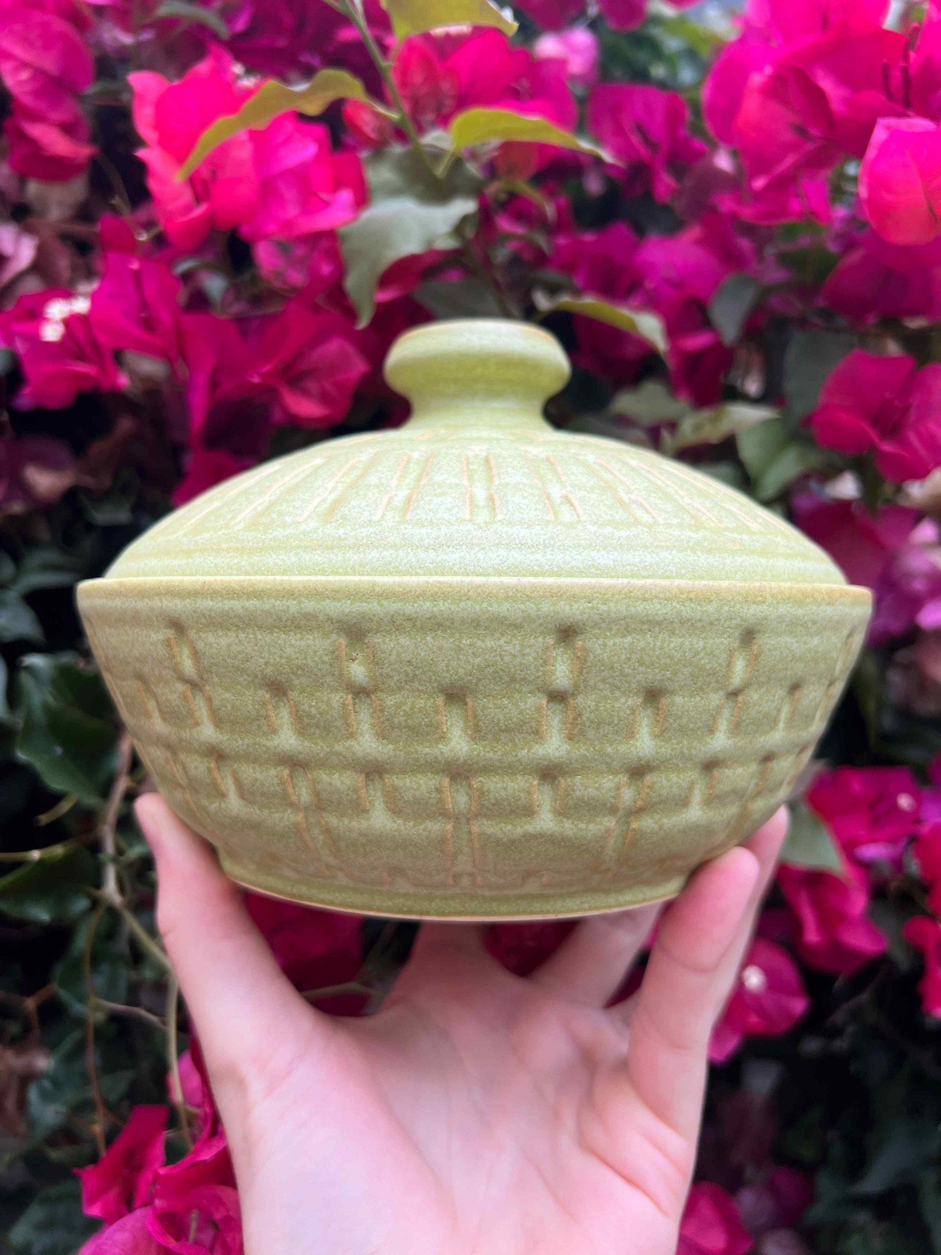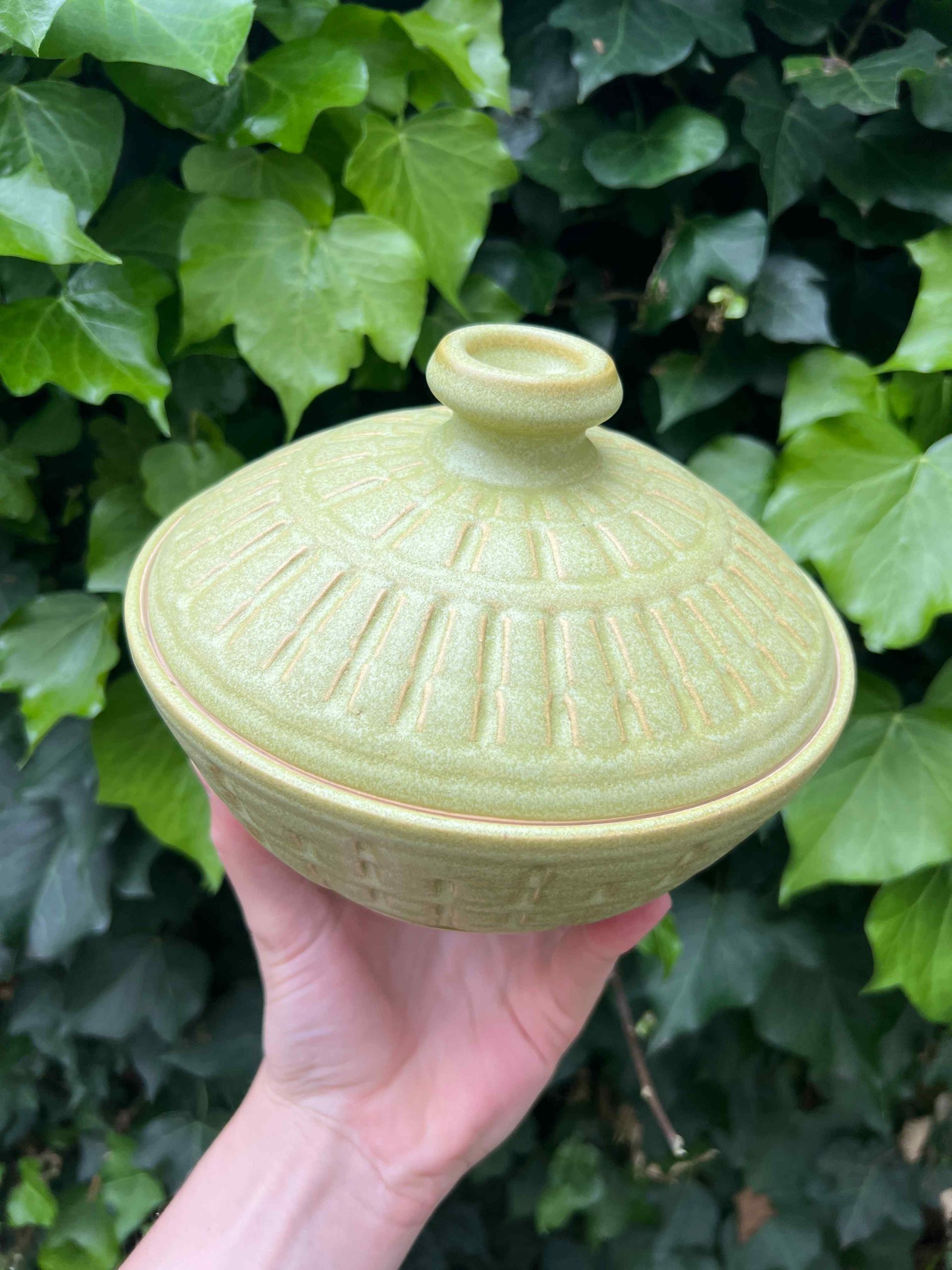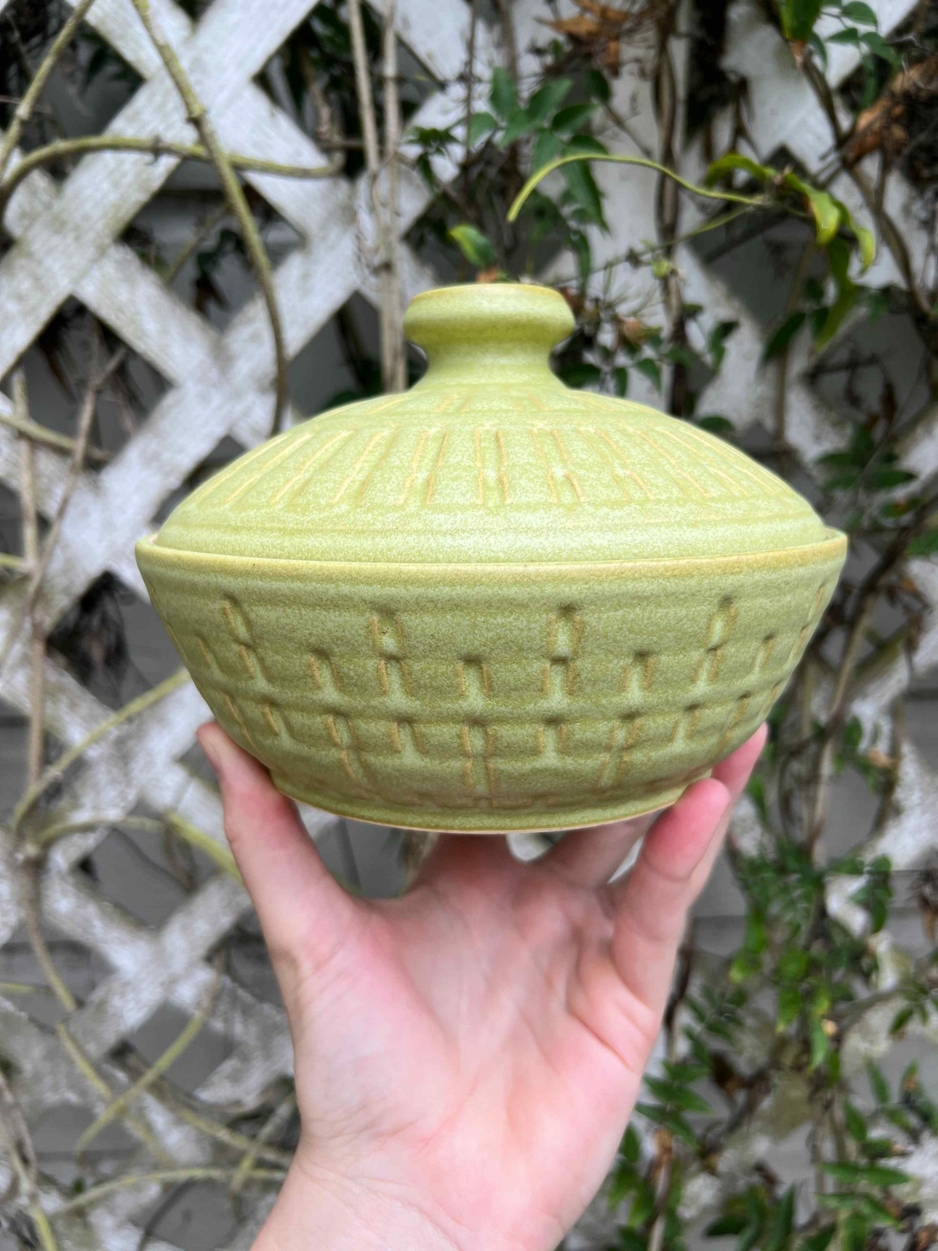 This unique green jar is a great decorative piece or great for serving food at your next dinner party. The texture is added after the trimming process. The perfect piece for any home.
