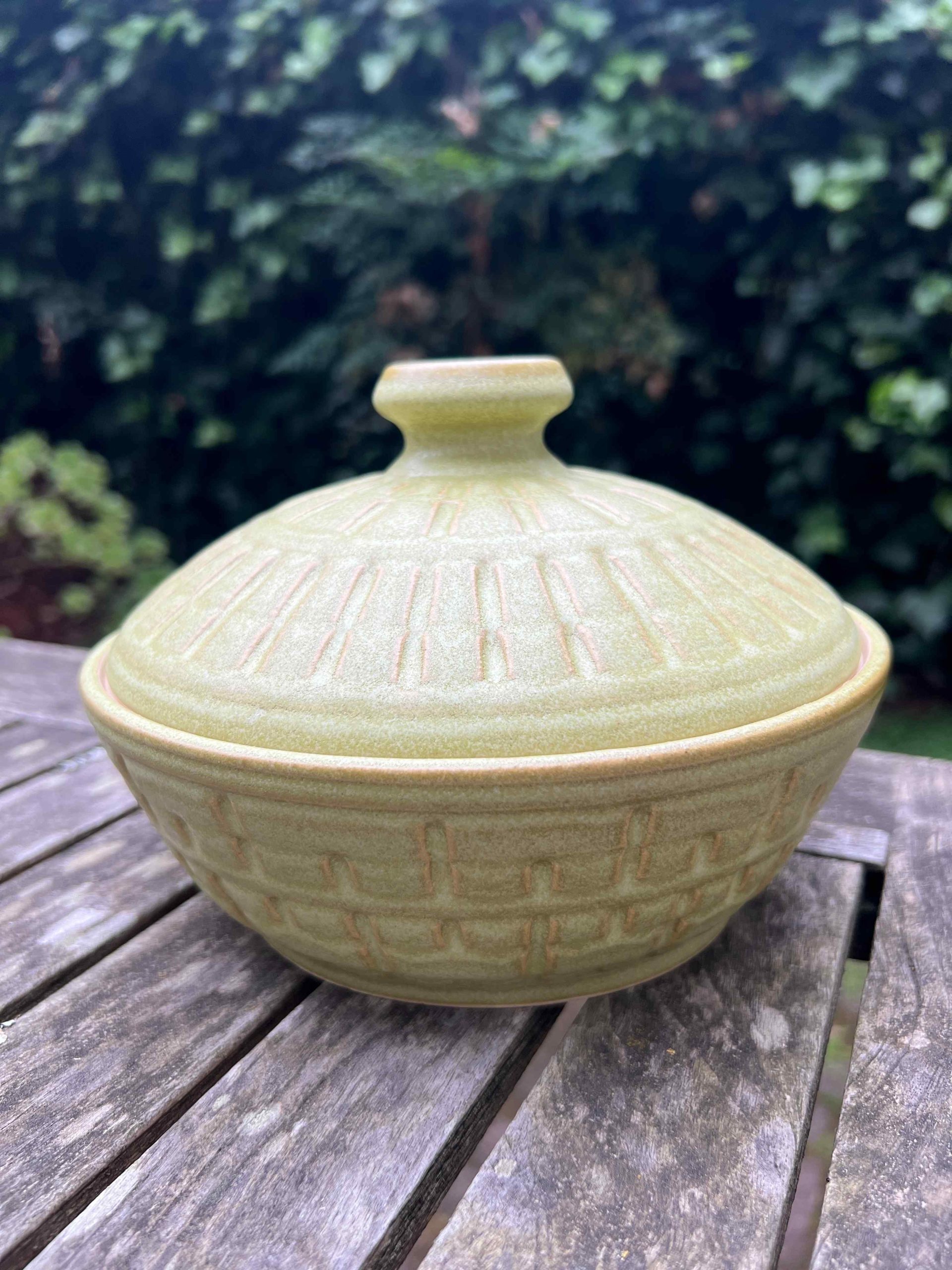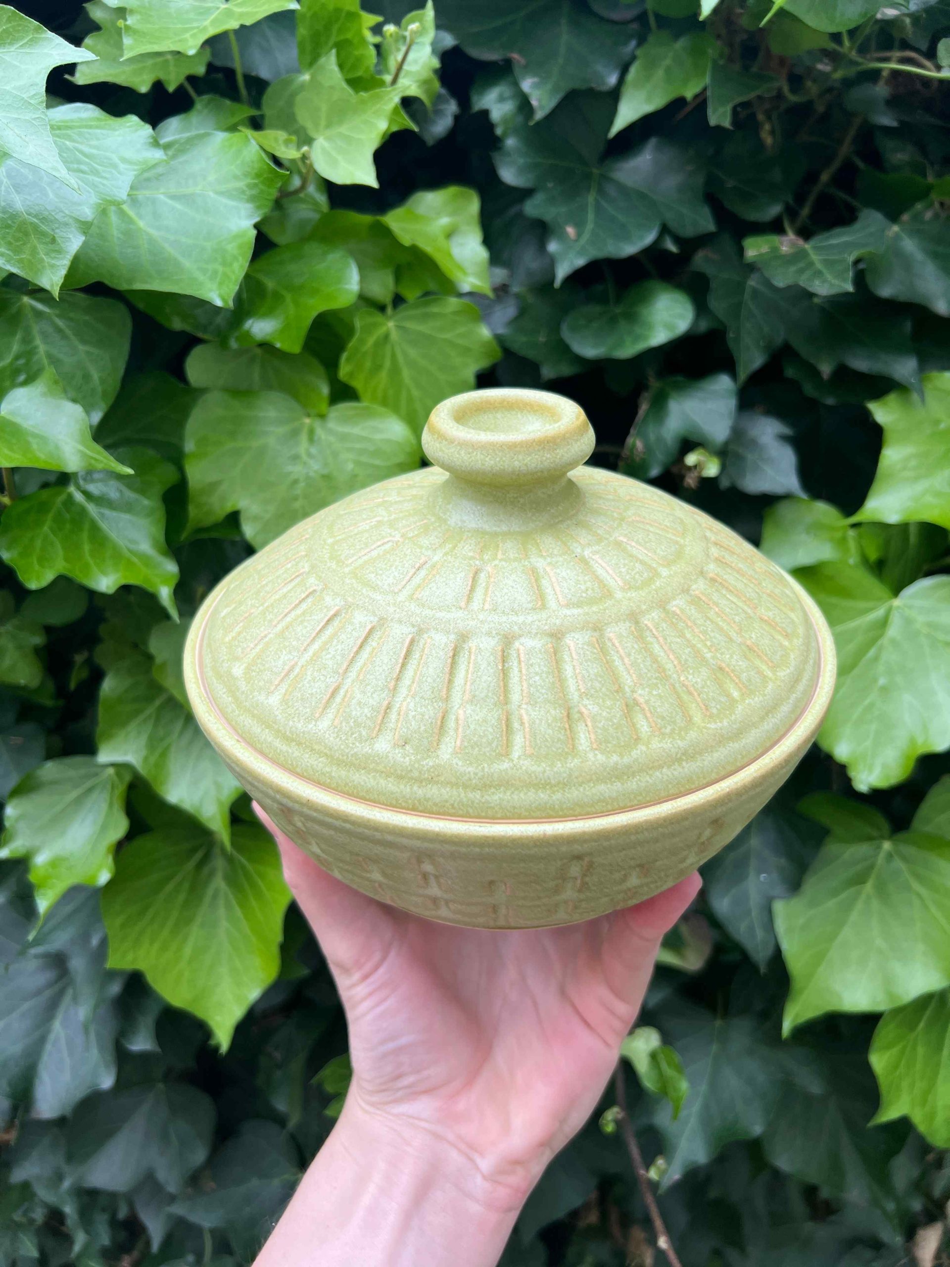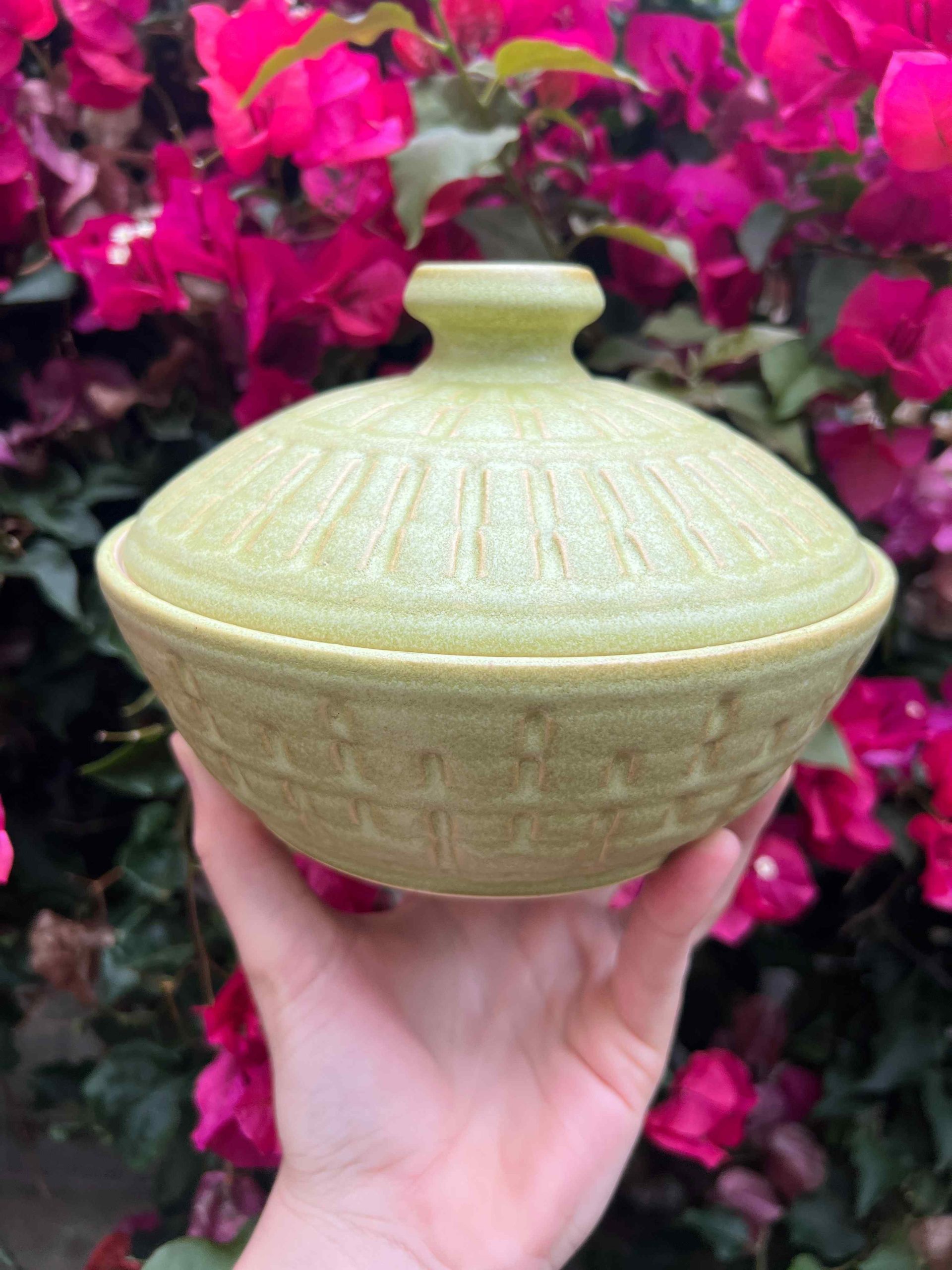 This unique green jar is a great decorative piece or great for serving food at your next dinner party. The texture is added after the trimming process. The perfect piece for any home.
