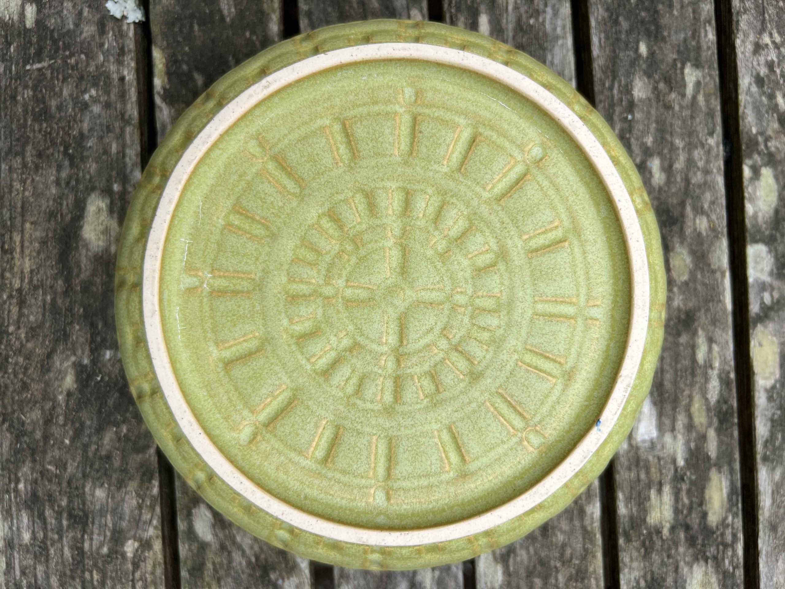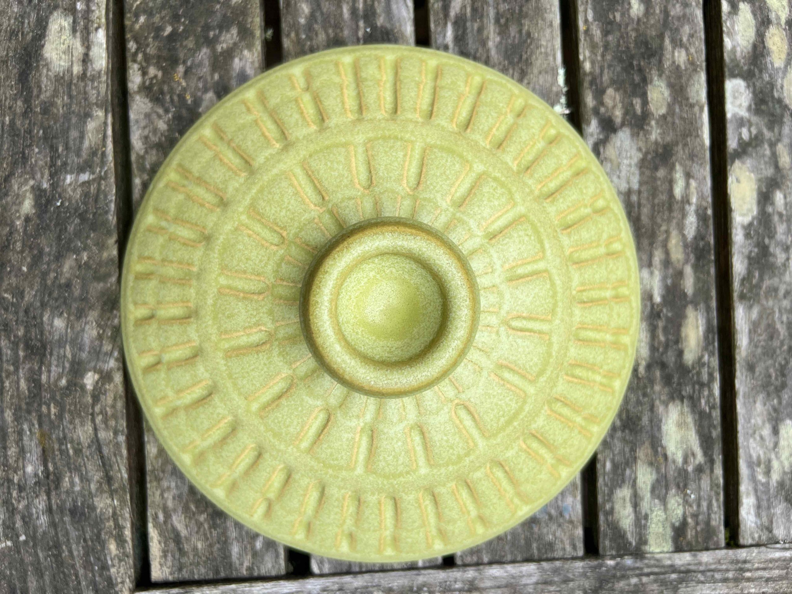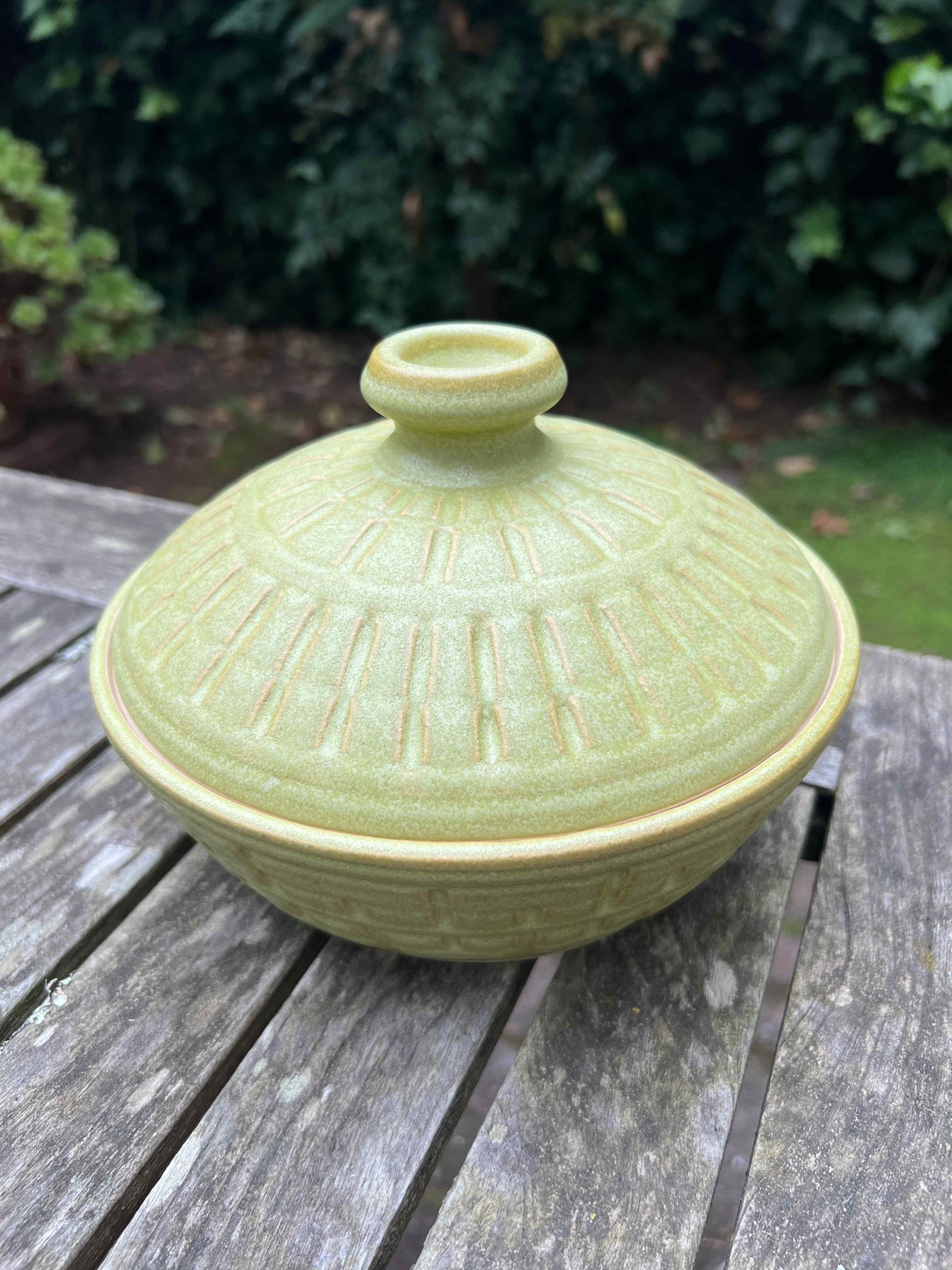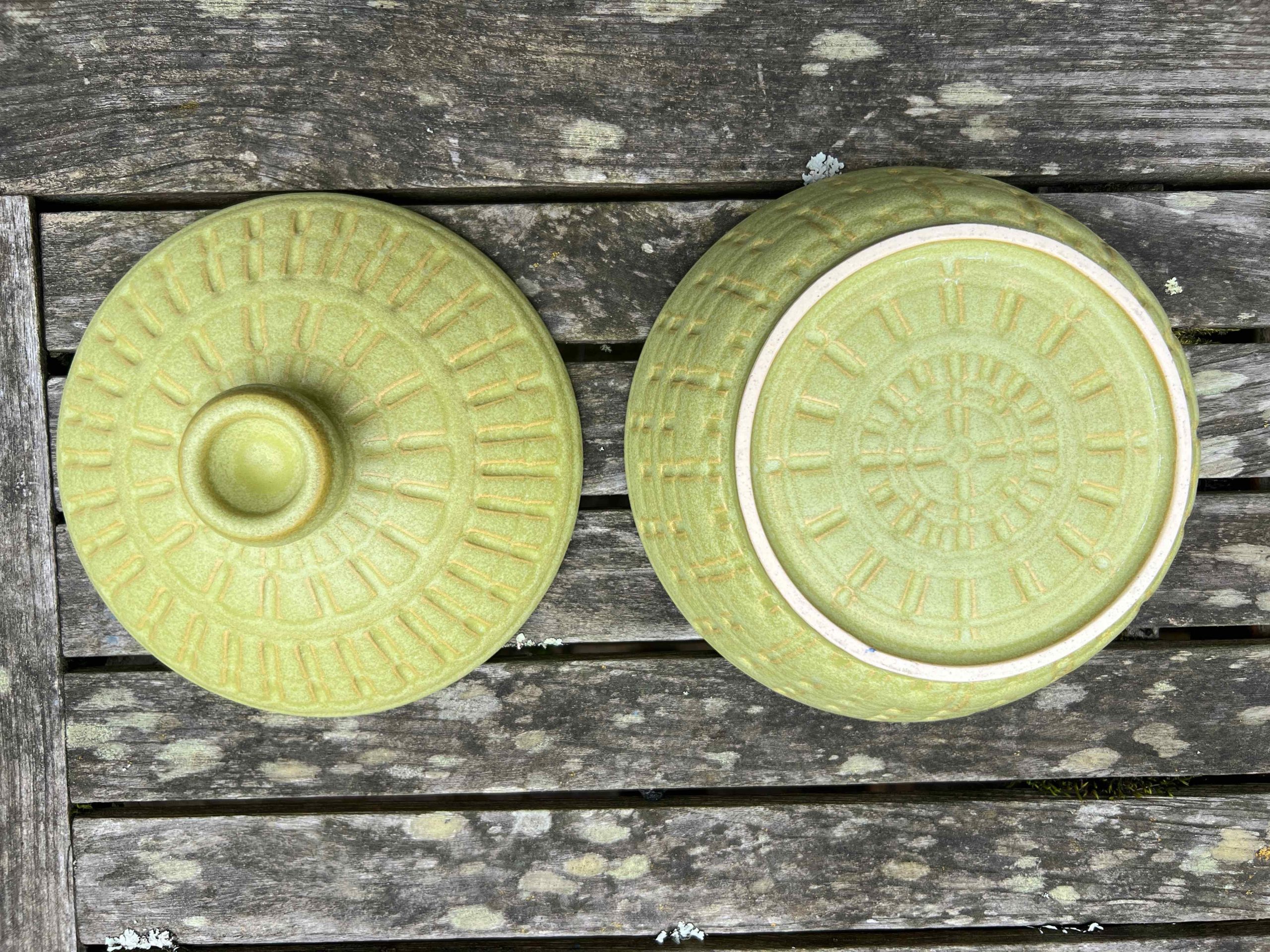 This unique green jar is a great decorative piece or great for serving food at your next dinner party. The texture is added after the trimming process. The perfect piece for any home.