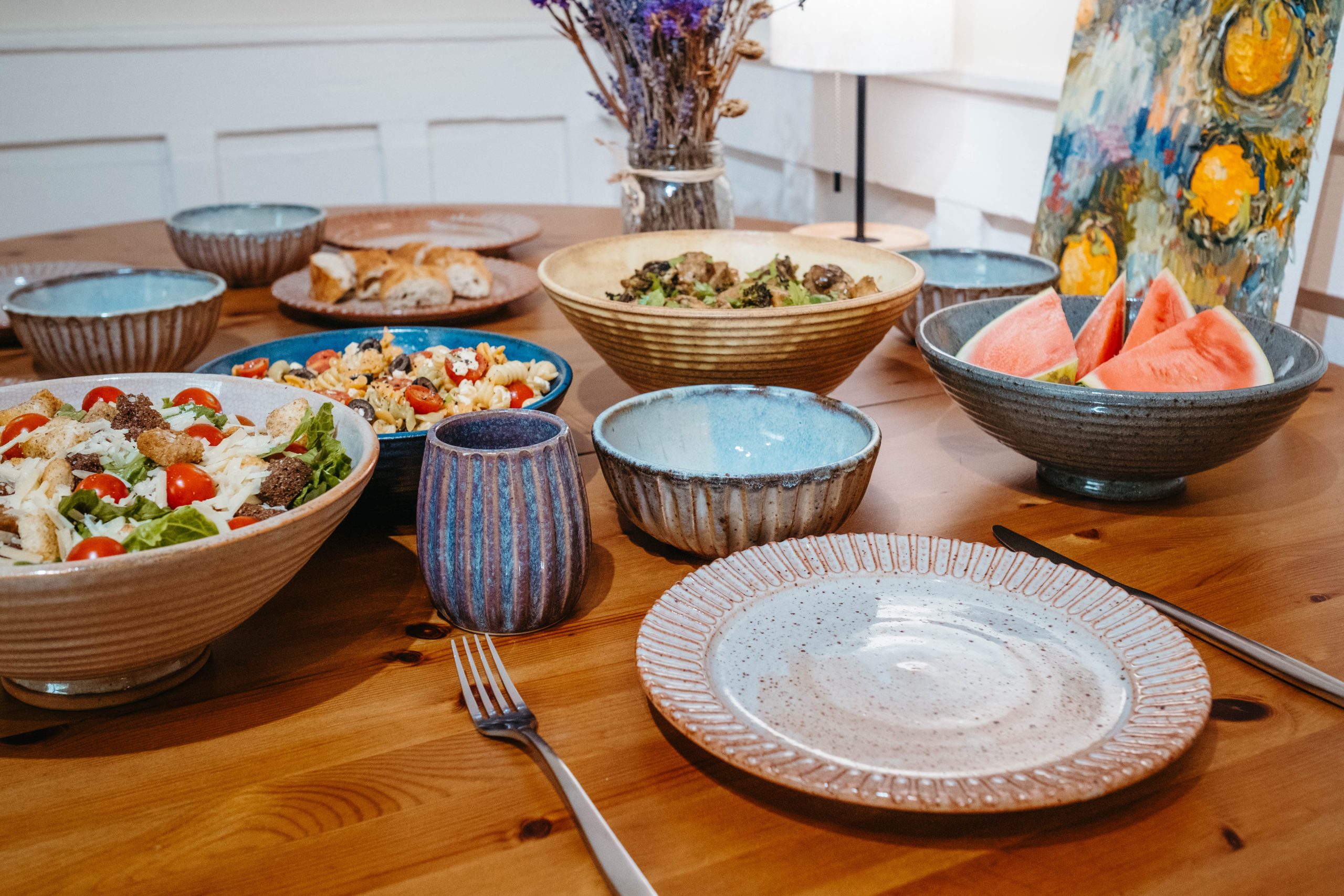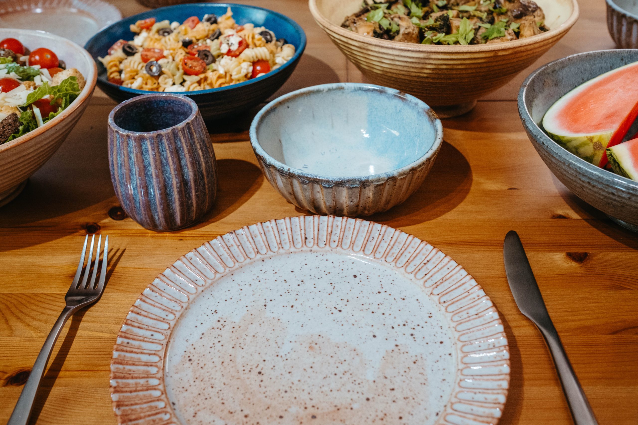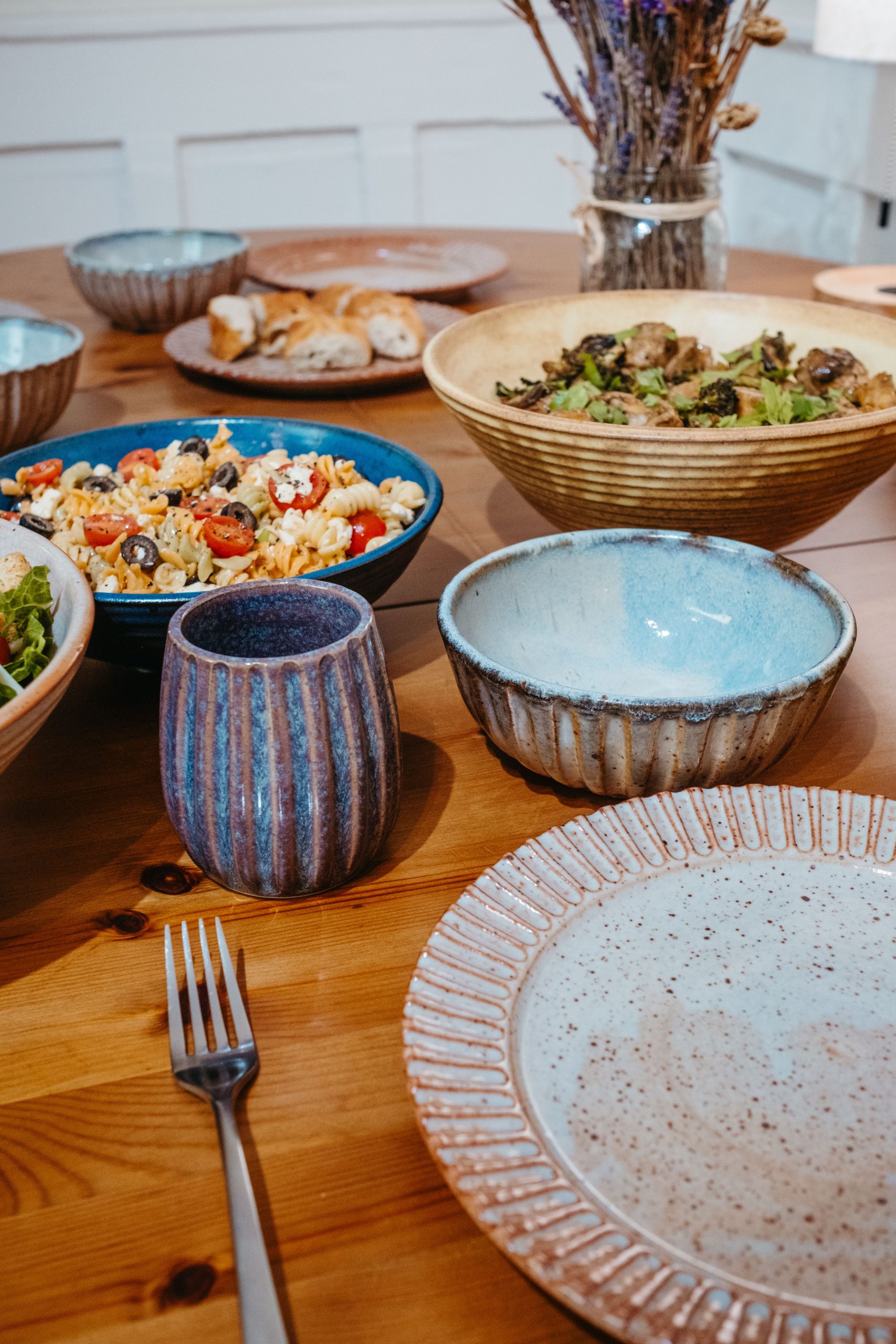 Start your kitchen with a handmade set for 2. The set includes 2 espresso mugs, wine tumblers, mugs, everyday bowls, blates plus 1 larger serving bowl & big bowl